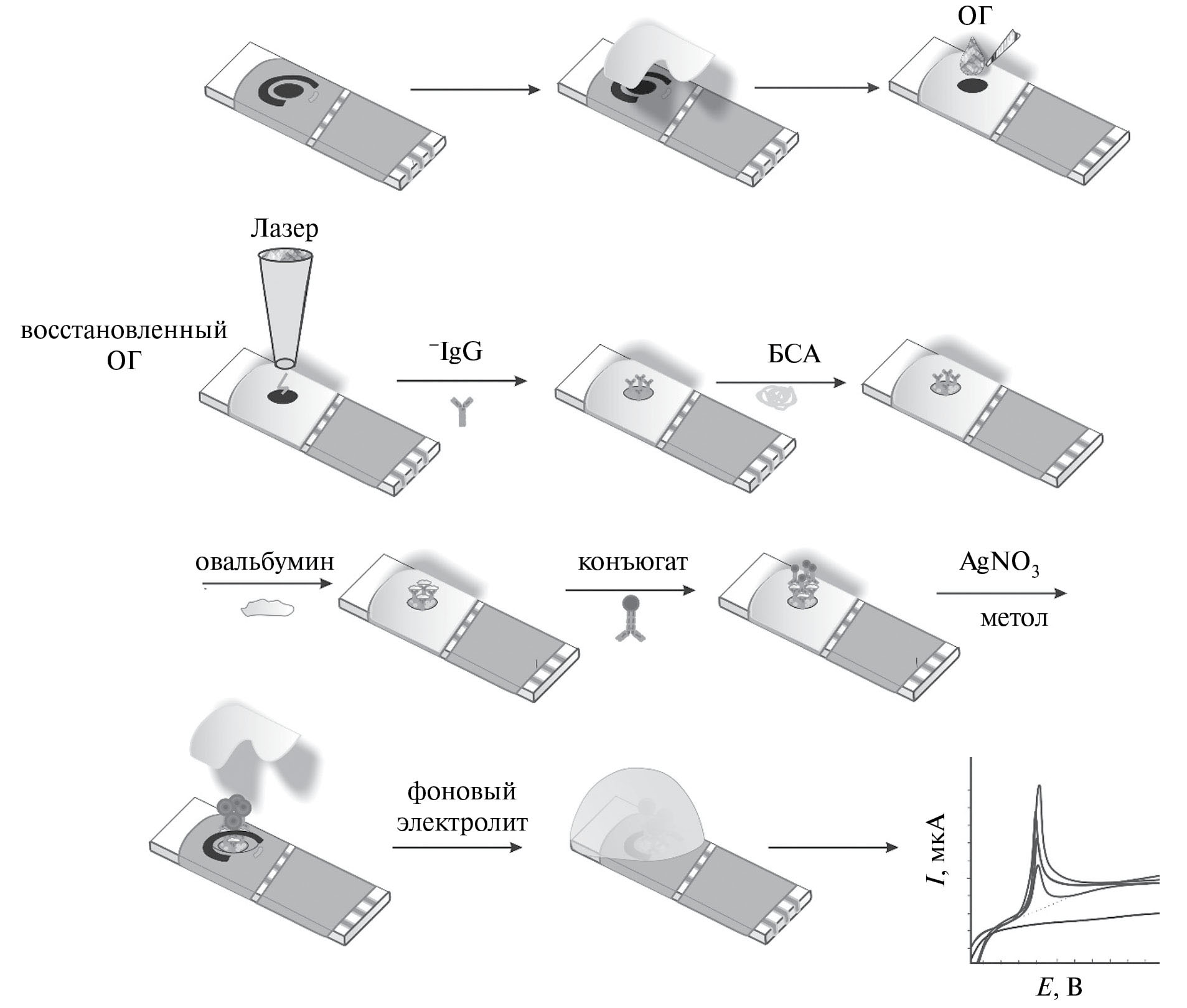 На первой стадии разработки электрохимического иммуносенсора модифицировали углеродсодержащий планарный печатный электрод ОГ. Для того чтобы в модификации электрода не участвовали части электрода, выполняющие функцию электрода сравнения и вспомогательного электрода, поверхность предварительно закрывали трафаретом из двустороннего скотча. При этом поверхность рабочего электрода оставалась незакрытой. Далее 100 мкл суспензии ОГ (2 мг/мл) (Sigma, Германия) наносили на рабочую часть поверхности электрода и осторожно высушивали в течение 2 ч при 22 ± 2 °C. Для улучшения токопроводящих свойств поверхности электрода и увеличения электроактивной площади поверхности ОГ восстанавливали с помощью лазерного гравера мощностью 600 мВт при длине волны 405 нм [9, 10]. Инкубационный период для каждого шага иммобилизации биологического материала на поверхности восстановленного ОГ составлял 1 ч при 37 °С. После каждого этапа иммобилизации биологического материала трижды ополаскивали поверхность сенсора дистиллированной водой для удаления несвязанных компонентов. Для иммобилизации коммерческих иммуноглобулинов кролика против овальбумина использовали 100 мкл раствора с концентрацией 1 мкг/мл. Далее на поверхность сенсора наносили блок-реагент – 0.5%-ный раствор бычьего сывороточного альбумина (БСА), по 100 мкл на каждый электрод. После этого на поверхности электрохимических сенсоров раскапывали по 100 мкл растворов овальбумина в концентрациях, соответствующих линейному диапазону от 0.5 до 24.0 нг/мл, или испытуемую вакцину в том же объеме. После иммобилизации овальбумина на поверхность каждого сенсора наносили по 100 мкл конъюгата IgG@НЧAu. Далее на поверхность сенсоров наносили по 100 мкл 0.5%-ного раствора AgNO3 и 100 мкл раствора восстановителя – смеси 0.25%-ной лимонной кислоты и 0.2%-ного метола. Данная процедура позволила усилить сигнал золота серебром при его каталитическом восстановлении на поверхности НЧAu конъюгата IgG@НЧAu. Время восстановления серебра составило 3 мин. Далее на поверхность сенсора наносили 200 мкл фонового электролита и регистрировали сигнал серебра методом инверсионной вольтамперометрии. Для контроля специфичности разработанного электрохимического иммуносенсора в качестве отрицательных контрольных образцов использовали неспецифические к овальбумину IgG свиньи, иммобилизованные на поверхности иммуносенсора, а также БСА. В качестве метода сравнения для определения овальбумина в вакцинах использовали метод ИФА.