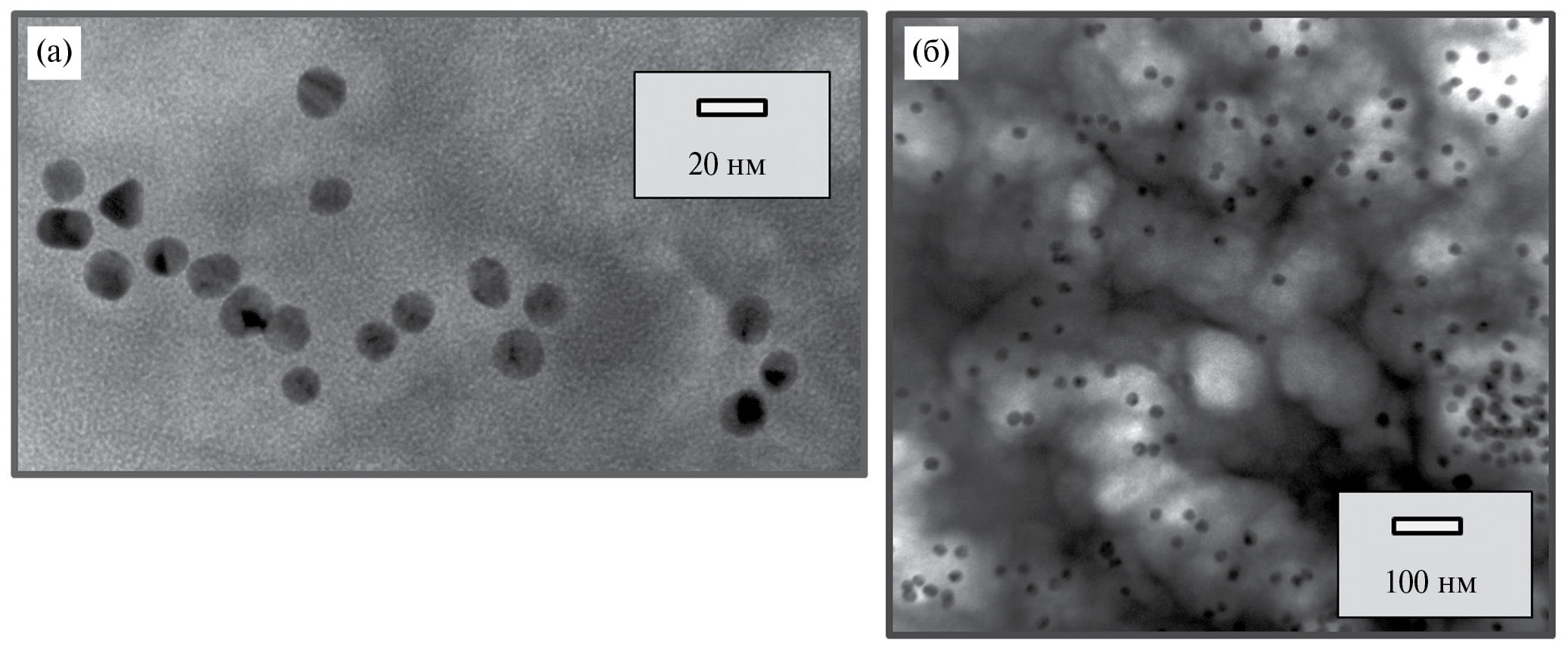 Рис. 3. Изображения, полученные методом просвечивающей электронной микроскопии, (а) НЧAu и (б) конъюгатов IgG@НЧAu (контрастирование IgG 2.0%-ным раствором уранил ацетата).