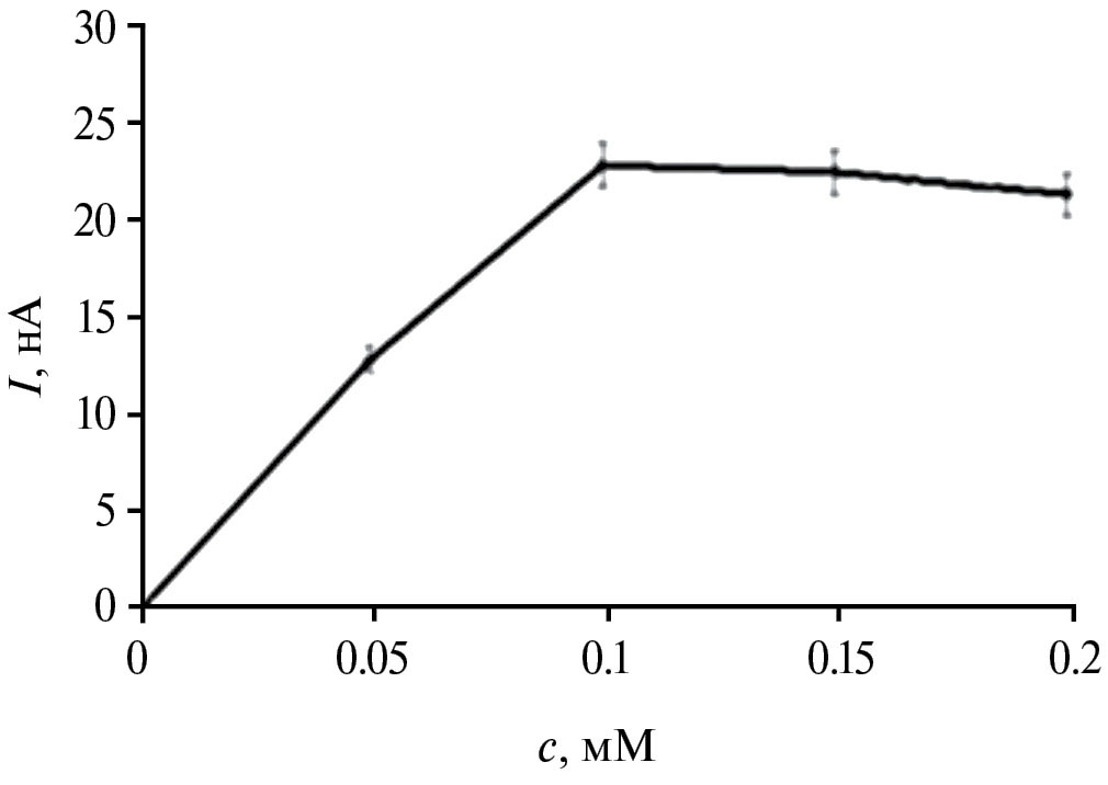 Оптимальная концентрация золота для модификации поверхности СУЭ. Оптимизация эффективных параметров обнаружения аналита играет важную роль в повышении чувствительности сенсора. Влияние содержания золота на электрохимическое окисление и восстановление амикацина на Ar/ЗСУЭ исследовали по изменению его аналитического сигнала. Установили, что увеличение концентрации золота до 0.1 мМ в растворе приводит к увеличению тока пика окисления амикацина, при дальнейшем изменении концентрации золота ток пика остается практически постоянным (рис. 5). Концентрацию золота 0.1 мМ приняли в качестве оптимальной для модификации поверхности СУЭ.