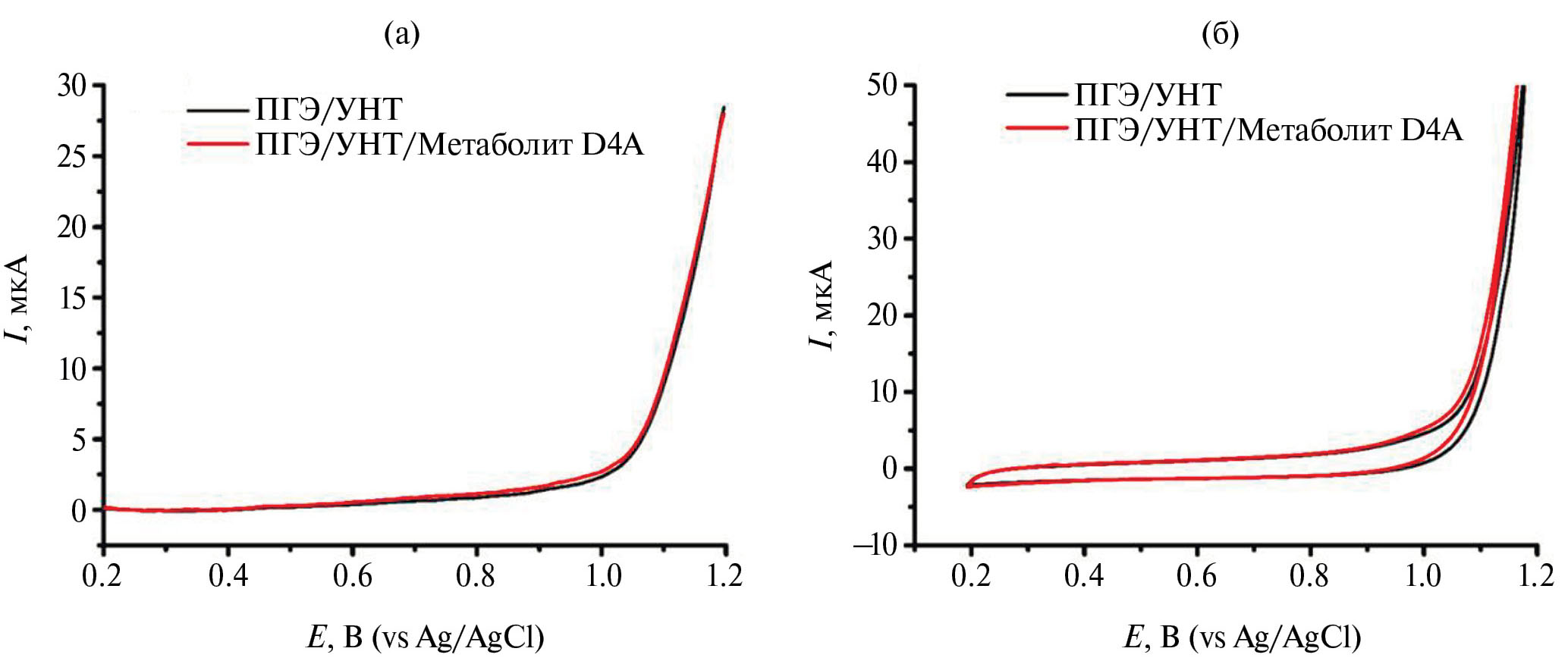 Рис. 2. (а) Дифференциально-импульсные вольтамперограммы ПГЭ/УНТ/D4A с концентрацией метаболита 100 мкМ в диапазоне потенциалов 0.2–1.2 В. (б) Циклические вольтамперограммы ПГЭ/УНТ/D4A в диапазоне потенциалов 0.2–1.2 В.