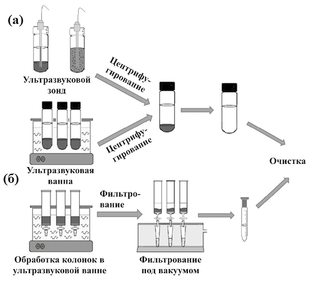Рис. 1. Схема проведения ультразвуковой экстракции из твердых образцов с использованием ультразвукового зонда (а) или ультразвуковой ванны (б) [80].