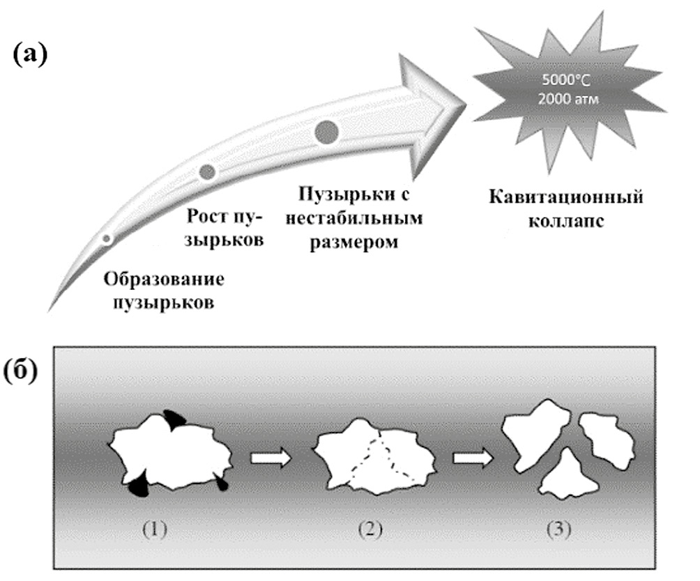 Рис. 2. Явление кавитации. (а) Развитие и коллапс кавитационных пузырьков. (б) Кавитационный коллапс на границе твердого тела и жидкости. Последовательность (1)–(3) показывает схему фрагментации или разрушения твердых частиц, что приводит к уменьшению их размера (увеличению площади поверхности) [73].