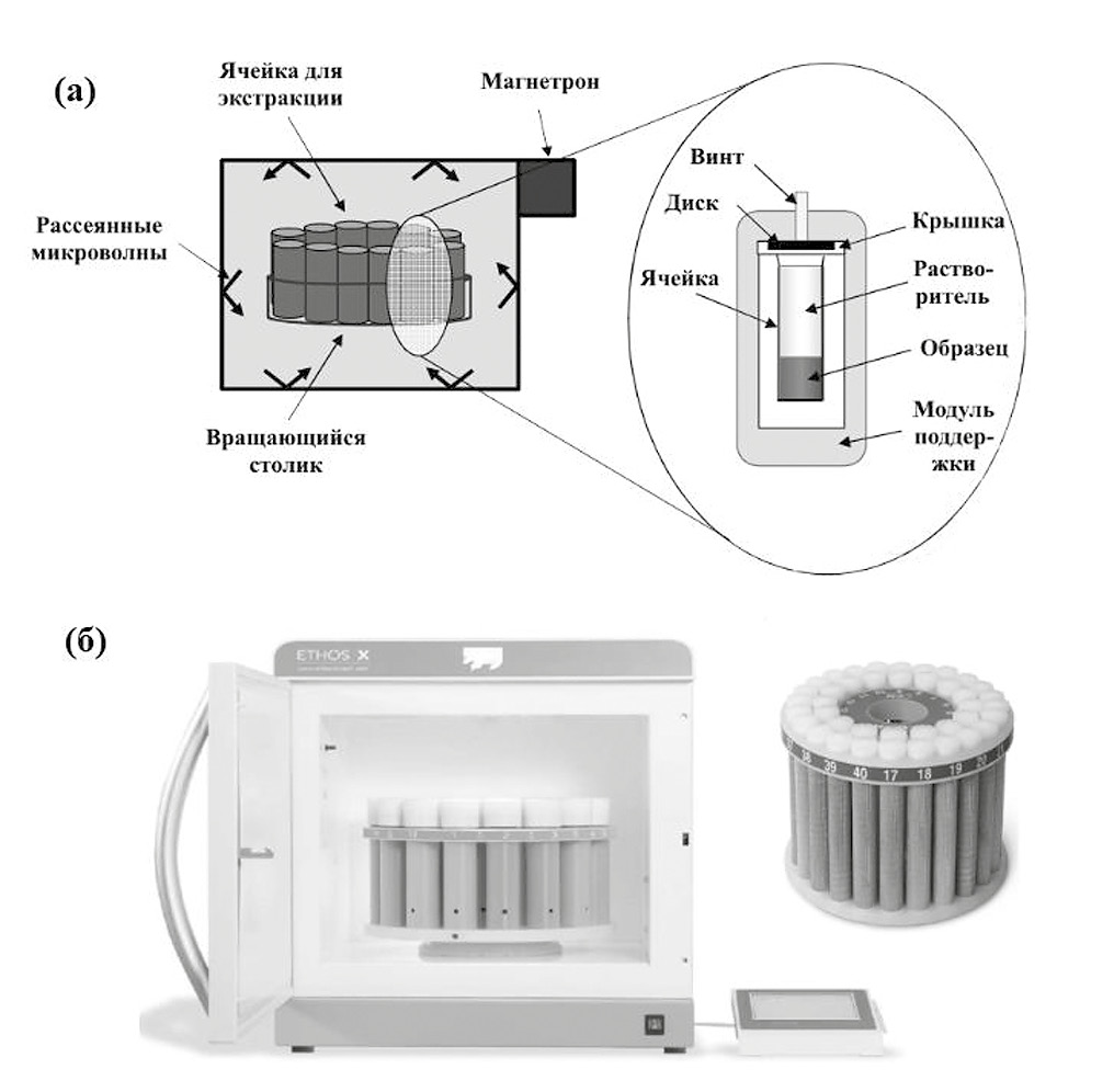 Рис. 3. (а) Принцип микроволновой экстракции в закрытых сосудах. (б) Коммерческий прибор для проведения микроволновой экстракции на 40 проб [106].