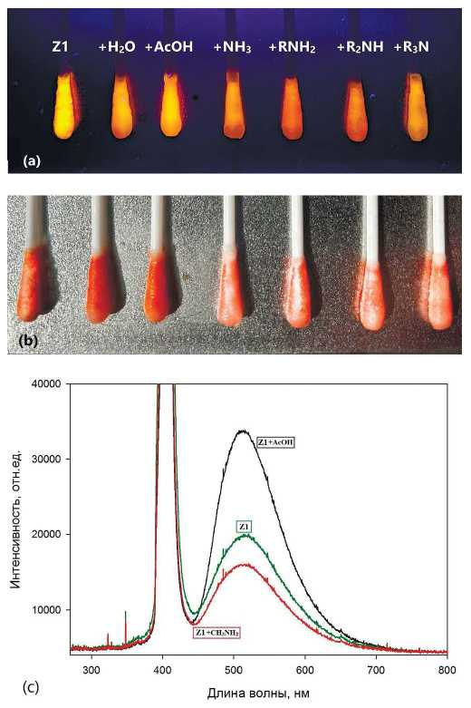 Флуоресценцию на целлюлозных носителях изучали визуально и с помощью лазера, спектры регистрировали на спектрометре Maya 2000 Pro (OceanOptics, США). Такой вариант оценки эффекта взаимодействия флуоресцентных зондов и тест-веществ наиболее информативен, так как позволяет изучить реакцию реагента на носителе любой природы и паров тест-веществ с исключением влияния растворителей.