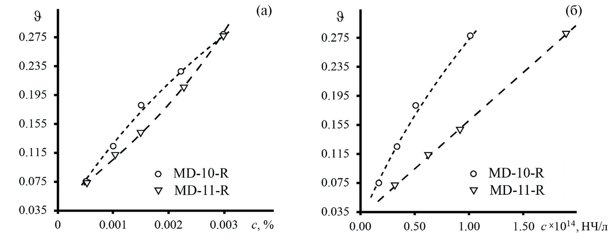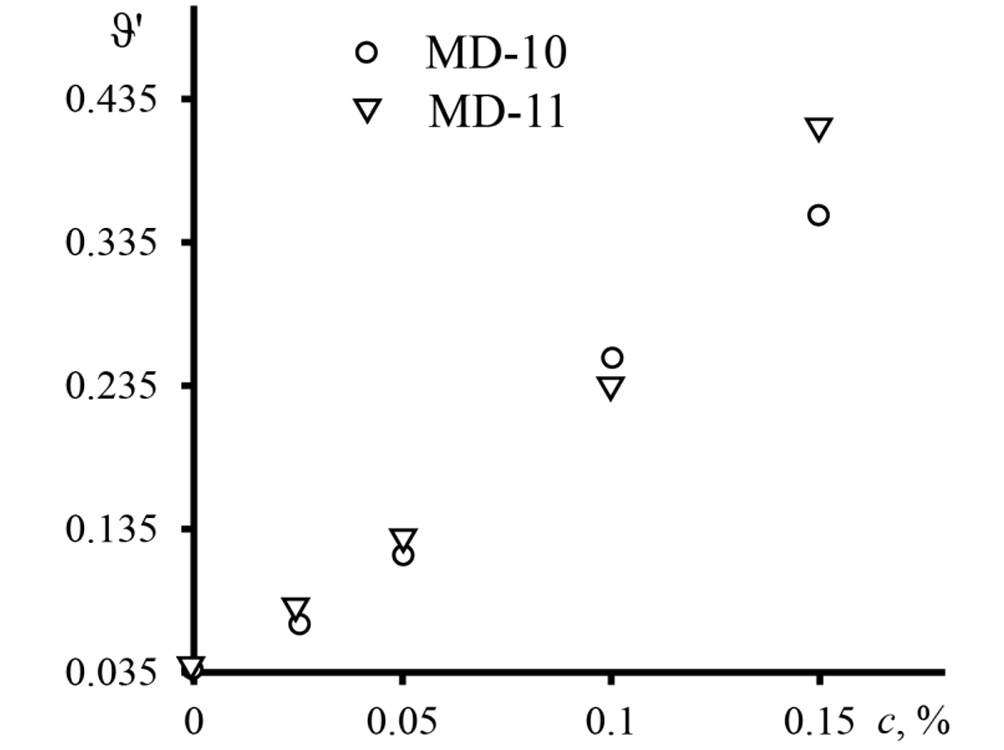 Анализ спектров светопоглощения водных растворов частиц полистирола показал, что дисперсии имеют значительное светорассеяние при 532 нм. На рис. 2 представлены электронные спектры исследуемых образцов. Результаты измерения светорассеяния при помощи термолинзового спектрометра показали, что дисперсия MD-10 (80 нм) характеризуется ожидаемо бóльшим светорассеянием в сравнении с MD-11 (65 нм) при тех же массовых концентрациях (рис. 3).