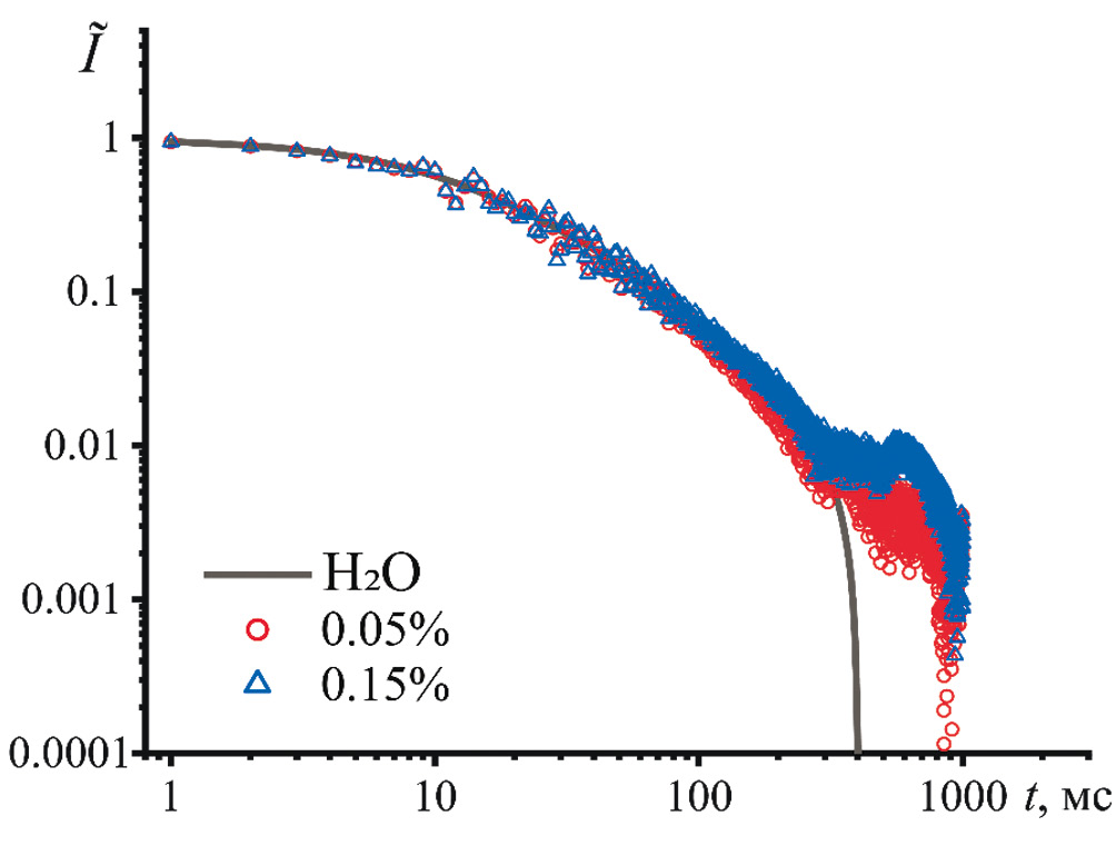 Рис. 8. Времяразрешенные кривые для дисперсий наночастиц полистирола, измеренные в течение 1 ч и усредненные из 2000 времяразрешенных кривых. Длина волны 532 нм, мощность излучения 300 мВт.