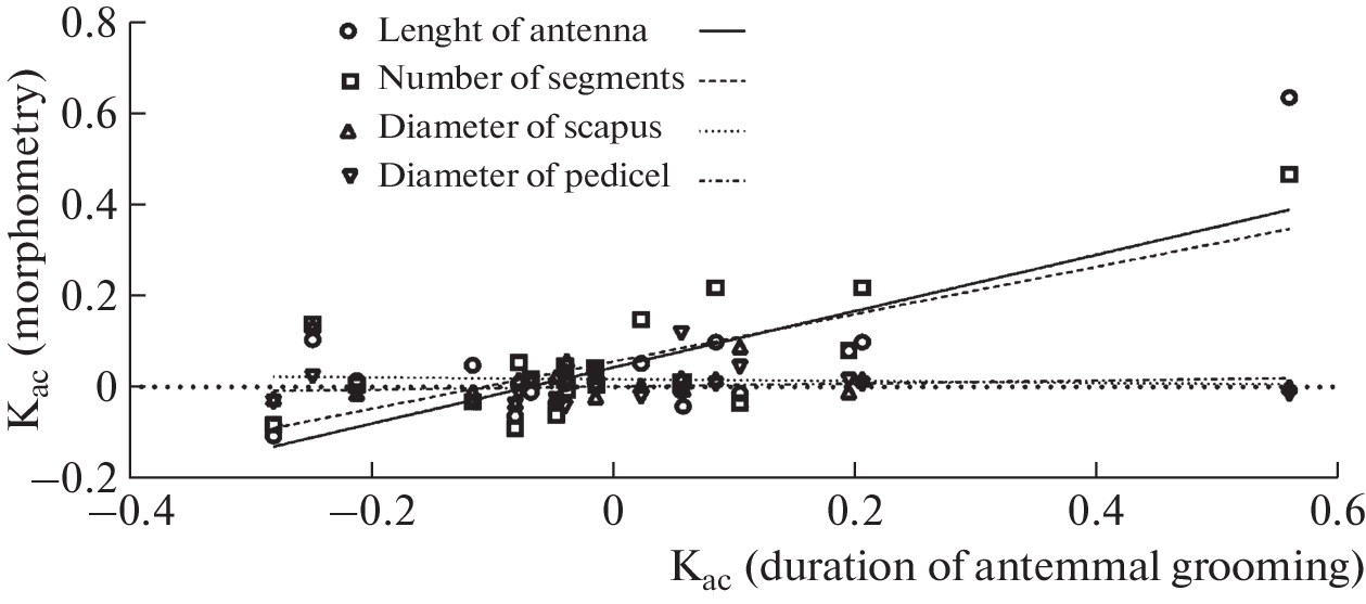 Animal behaviors are often characterized by behavioral asymmetry, or lateralization, which is caused in part by the morphological asymmetry of the body and/or brain. To test the hypothesis that functional asymmetry of grooming is connected with morphological asymmetry of the antennae in American cockroach Periplaneta americana, we measured the length of the antennae, scapus diameter, pedicel diameter and length, and segment’s diameter and length. The data obtained indicate statistically significant differences: segment length is greater on the left antennae, and segment width is greater on the right antennae, except for a short region near the base. Correlation analysis revealed the following relationships: longer right antenna corresponds to more time spent cleaning it; scapus diameter larger on the right antenna correlates with antenna cleaning frequency; asymmetry of flagellum segments has no effect on cleaning asymmetry. Presenting sex pheromone at a suprathreshold dose increased asymmetry of antennal grooming, while asymmetry for leg grooming was generally unchanged. Thus, the asymmetry of antennal grooming, resulting at least in part from morphological asymmetry, significantly changes in the presence of a biologically important olfactory stimulus, the sex pheromone.