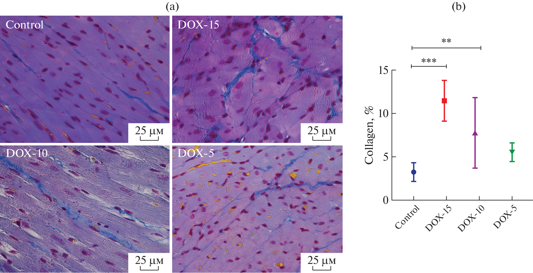 Text of the abstract. The study is devoted to the investigate of the molecular markers profile of fibrosis when various doses of doxorubicin are administered to Wistar drain rats. The study was performed on 40 male Wistar rats weighing 260 ± 19 g. Animals were divided into 4 groups: control and three experimental groups with a certain frequency of administration (6 times in two days) and a certain dose of doxorubicin (5, 10, 15 mg/kg, intraperitoneally). At the end of the administration of the chemotherapy drug, the animals were observed for 2 months. To solve this aim, the hearts were taken from anesthetized animals for molecular and morphological studies. Histological, echocardiographic and molecular analyses revealed dose-dependent damaging changes in the left ventricular myocardium against the background of exposure to various doses of doxorubicin. The expression level of TGF-β did not differ from the control values 2 months after the end of administration of all cumulative doses of the chemotherapy drug. However, at this stage of the study, the preserved increased expression of type I, type II collagen, ET-1, FGF4 and TNF-α was characteristic of animals receiving the maximum cumulative dose of doxorubicin, which may reflect the incompleteness of the fibrous tissue formation process, as well as their active participation in the development of inflammatory processes with pronounced cardiotoxic damage against the background of exposure the chemotherapy drug. For animals receiving 10 mg/kg, there were no changes in these molecular markers of fibrosis compared to the control group, whereas in the group of animals with the minimum cumulative dose of the drug, a decrease in the expression of COL I, II type, ET-1, TNF-α and an increase in FGF4 levels were revealed.