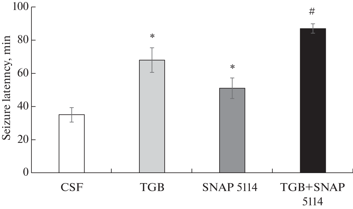 Hyperbaric oxygen (HBO2) inhibits GABAergic neurotransmission in the brain, which can lead to the development of a seizure disorders known as “oxygen epilepsy”. Deficiency in GABAergic transmission in HBO2, resulting from a decrease in the level of synaptic GABA, can be compensated by inhibition of neuronal and glial GABA transporters (GAT). The present study compared the anticonvulsant efficacy of two types of GABA transporters with tiagabine, a GAT-1 inhibitor, and SNAP 5114, a GAT-3 inhibitor. Anticonvulsant effects were assessed after administration of drugs into the lateral cerebral ventricle of rats 30 min before the start of hyperbaric oxygen exposure at 5 ATA. In separate experiments, the concentration of GABA in the striatum of rats was measured when breathing oxygen at a pressure of 5 ATA after GAT inhibition with tiagabine or SNAP 5114. New results obtained in the study were: (1) inhibition of GAT-1 or GAT-3 prevented the development of “oxygen epilepsy” in rats; (2) among the two inhibitors used, TGB was found to be more effective in preventing oxygen convulsions compared to SNAP 5114; (3) the combined use of TGB + SNAP 5114 caused an additive anticonvulsant effect; (4) oxygen convulsions appeared when GABA in the brain decreased by 30–40% of the initial level; (5) GAT-1 inhibition with tiagabine increased extracellular GABA 2.9-fold and 1.7-fold with SNAP 5114. GAT-1 and GAT-3 inhibition increased GABA to a level sufficient to restore impaired inhibitory neurotransmission in HBO2, and prevented the development of hyperbaric oxygen convulsions.