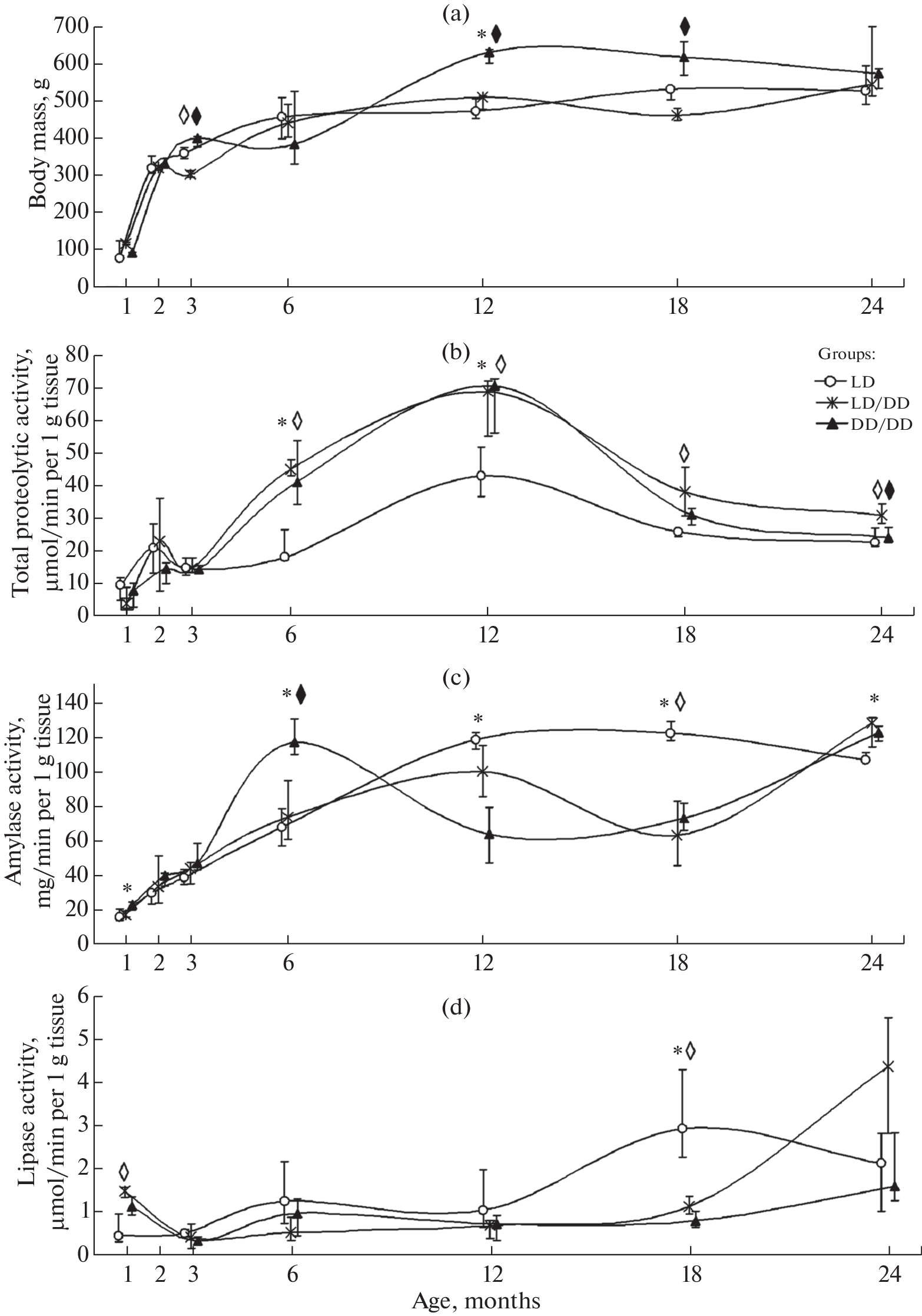 The effects of light deprivation on age-related changes in body weight, food and water intake, as well as the activity of digestive enzymes in pancreatic tissues of male rats was studied. Animals were divided into three groups: the first was in standard light conditions (12 h light/12 h dark, control, LD), the second was kept under conditions of long-term light deprivation from the moment of birth (LD/DD), and the third – from the prenatal period (DD/DD). Prolonged keeping of rats under conditions of light deprivation led to disruption of the age-associated dynamics of the studied parameters, at the same time, the detected changes in response to a specific light condition differed depending on the stage of ontogenesis at which its exposure began. Thus, body mass (age 3 and 18 months) and food and water intake (12 months), amylase and lipase activities (18 months) were lower, and protease activities after the end of the stable growth stage (12, 18 and 24 months) were higher in LD/DD-rats than in LD-rats. Significant changes in the studied parameters were observed under DD/DD conditions in 12‑month-old and 18-month-old rats – body mass was the largest, and food and water intake were the lowest compared to LD and LD/DD. In addition, the maximum amylase activity (1 and 6 months) among the studied groups and the higher values of total proteolytic activity during the period of stable growth (6 and 12 months) were found in DD/DD-rats compared to controls. Thus, our results indicate that light deprivation disrupts the ontogenetic development program of the digestive system of mammals.