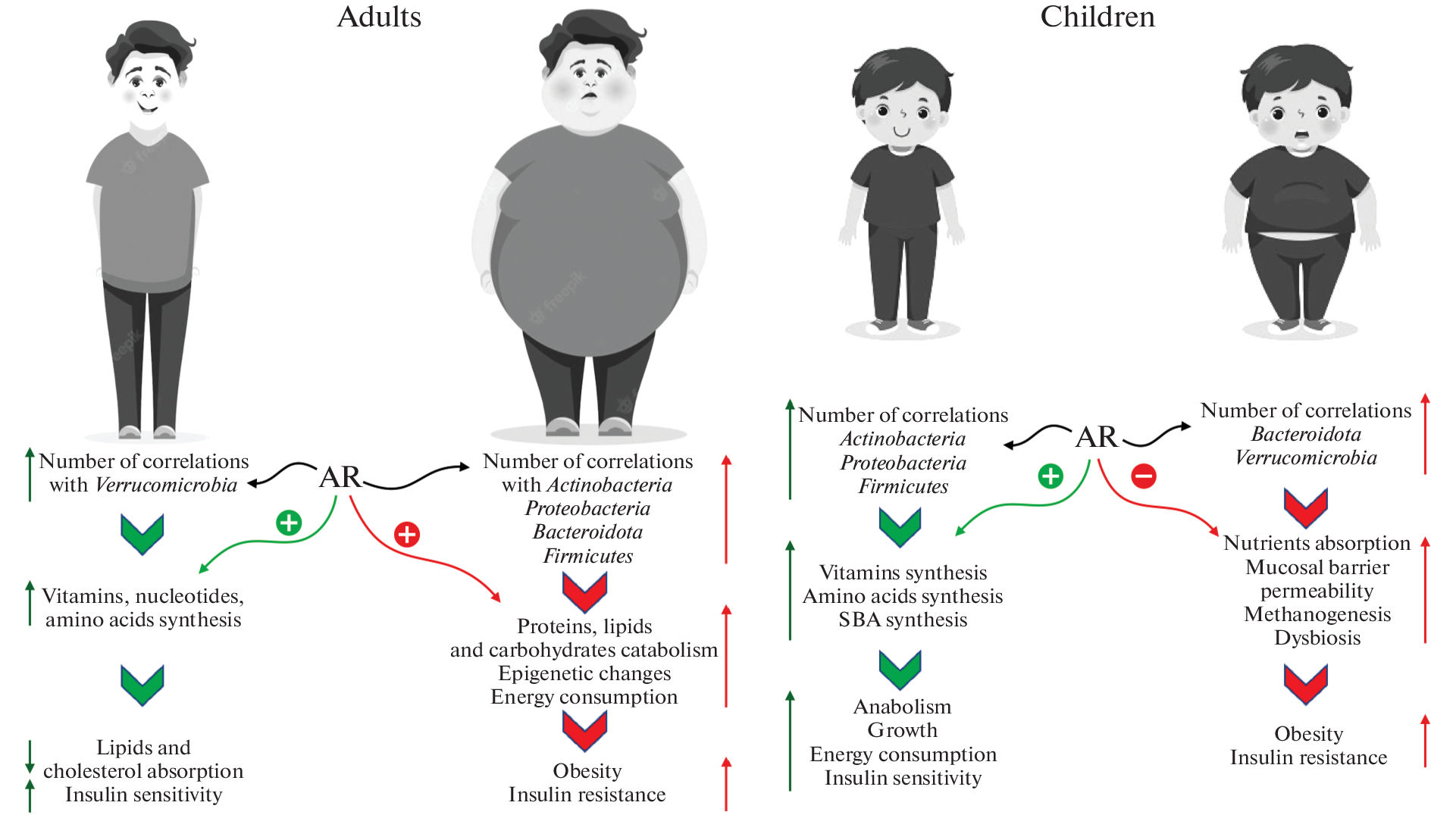 The human body is a superorganism that depends on the trillions of microbial cells that inhabit it. Developing along with the host during evolution, the microbiota forms the phenotypes of our ancestors. Mutations that arose in the process of natural selection led to the joint evolution of the host organism and microbial cells to environmental conditions and the development of adaptability to this environment. The composition and metabolic activity of the intestinal microbiota are found in various manifestations of processes, as well as in the development of pathological conditions and dysmetabolic diseases, including obesity. Alkylresorcinols (AR) are biologically active polyphenolic compounds of microbial origin that have the ability to highly influence host metabolism and the composition of their microbiota. In the present study, we performed metagenomic sequencing of microbial DNA isolated from the stool samples of 401 metabolically healthy and obese children and adults, and also determined the content of various AR homologues in these samples. Based on high-throughput sequencing data, we reconstructed the metabolic potential of the intestinal microbiota and assessed the correlations between the content of various AR homologues and the abundance of microbial enzymes. Based on the results obtained, we observed the features of functional changes in the intestinal microbiota observed in adults and children with obesity.