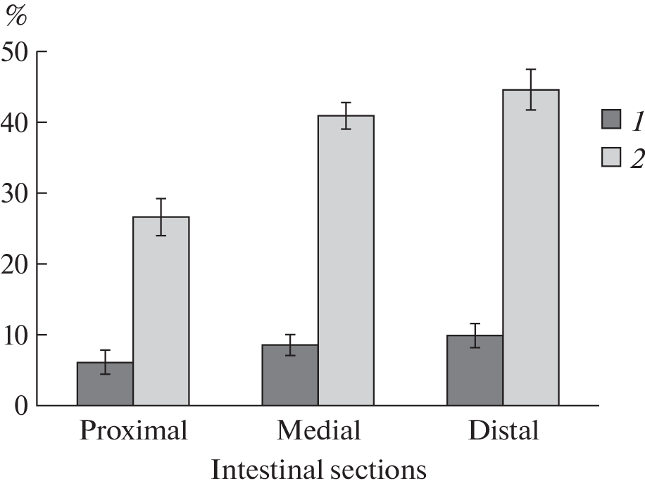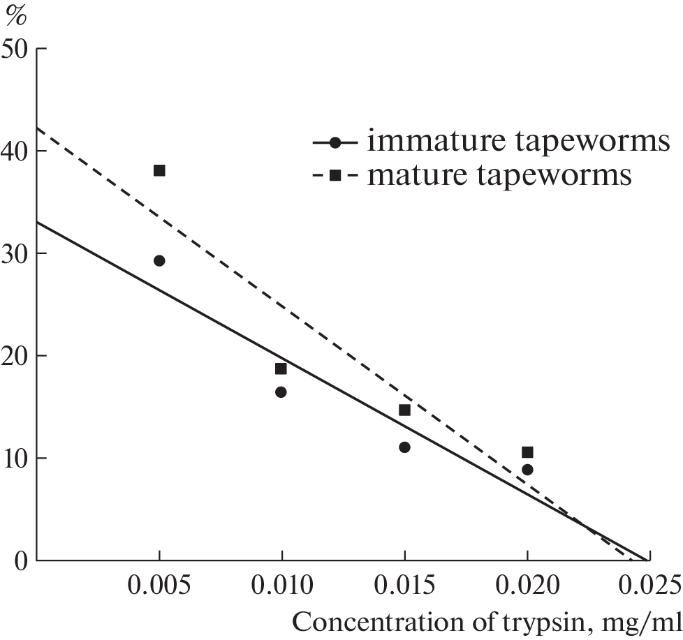The effect of infection of Tetrabothrius minor (Cestoda: Tetrabothriidae) on the protease activity of the mucous membrane of the small intestine of the Northern Fulmar Fulmarus glacialis was studied. Aspects of changes in the activity of proteases and protease subclasses (metalloproteases, serine proteases and cysteine proteases) by infection of T. minor, and the ability of T. minor to inactivate proteases from the intestinal mucosa and commercial trypsin were evaluated. It has been established that in the localization of T. minor (proximal and medial sections of the small intestine) decreased protease activity due to a decrease in the activity of serine proteases and metalloproteases. The dependence of the decrease of protease activity in the mucous membrane of the small intestine of the host on the parameters of infection with cestodes was found – the higher the infection intensity of T. minor, the lower the activity of proteases, including metalloproteases and serine proteases. The ability of T. minor homogenates to inhibit the activity of proteases from the mucosa of Northern Fulmar and the activity of commercial trypsin of different concentrations was noted.