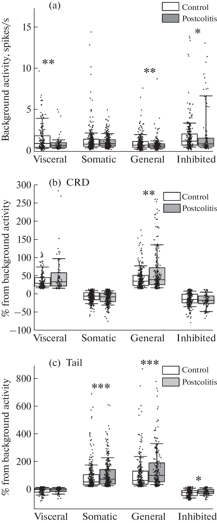 Dysfunction of the brain serotonergic system is thought to play a leading role in the pathogenesis of chronic abdominal pain and comorbid somatic hyperalgesia, which disturb a significant proportion of patients with digestive tract diseases, even in remission. However, the specific changes in the serotonergic structures nociceptive properties that can be initiated by organic pathology and persist after its resolution remain unclear. The aim of our neurophysiological study on anesthetized rats – healthy and recovered from colitis – was to identify the alterations in the raphe magnus (RMg) and dorsal raphe (DR) nuclei neuronal responses to visceral (colorectal distension) and somatic (squeezing of the tail) noxious stimulations that persist after resolution of intestinal inflammation. It has been shown that both nuclei contain different groups of nociceptive neurons: 1) responding with activation only to colorectal distension (visceral); 2) excited only by tail squeezing (somatic); 3) reacting with excitation to the both irritations (general); 4) responding with discharge inhibition to any of the stimulations (inhibited). Compared with healthy animals, in RMg of colitis-exposed rats the number of the inhibited cells was increased and the total proportion of excited nociceptive neurons was reduced. Distension of the inflammation-undergone intestine caused enhanced RMg neuronal inhibition, whereas squeezing of the pathology-unaffected tail led to increased excitation of the RMg selective somatic and general nociceptive cells. In turn, in the DR of postcolitis rats the inhibited neuron proportion was reduced, while the increased population of excited neurons included fewer visceral and more somatic selective cells. This was accompanied by an increase in the selective reactions of the latter to somatic pain stimuli and by an increase in non-selective DR neuron excitation by visceral and somatic pain signals. The identified neuronal alterations can contribute to the postcolitis impairment of the studied raphe nuclei functions in the endogenous control of visceral and somatic pain sensitivity.