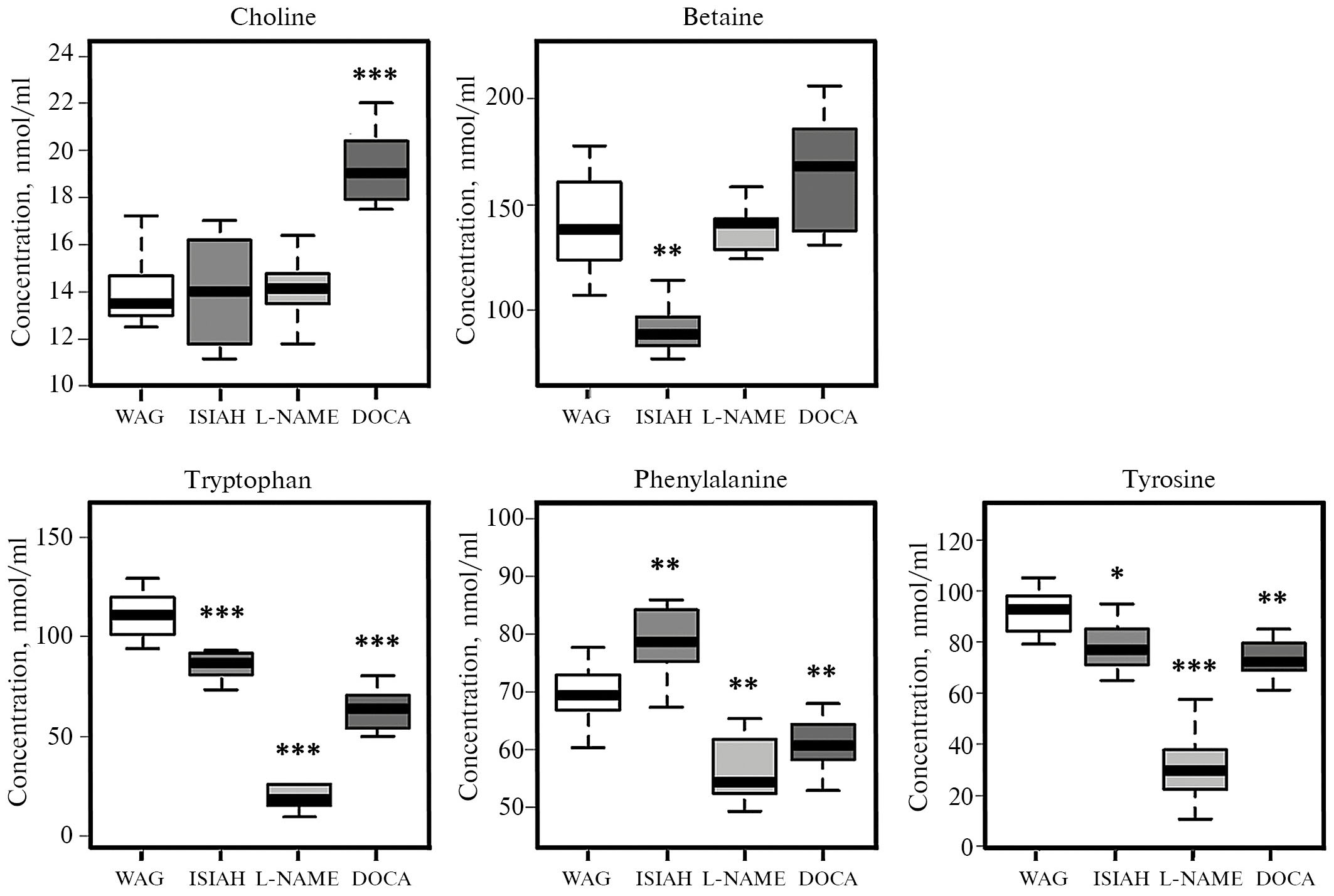 Рис. 1. Межгрупповые различия (ISIAH, L-NAME, DOCA vs WAG) в концентрациях метаболитов, связанных с метаболизмом холина (холин, бетаин), с почечной функцией (триптофан), с метаболизмом тирозина (фенилаланин, тирозин). Критерий Манна–Уитни, * – p < 0.05, ** – p < 0.01, *** – p < 0.001.