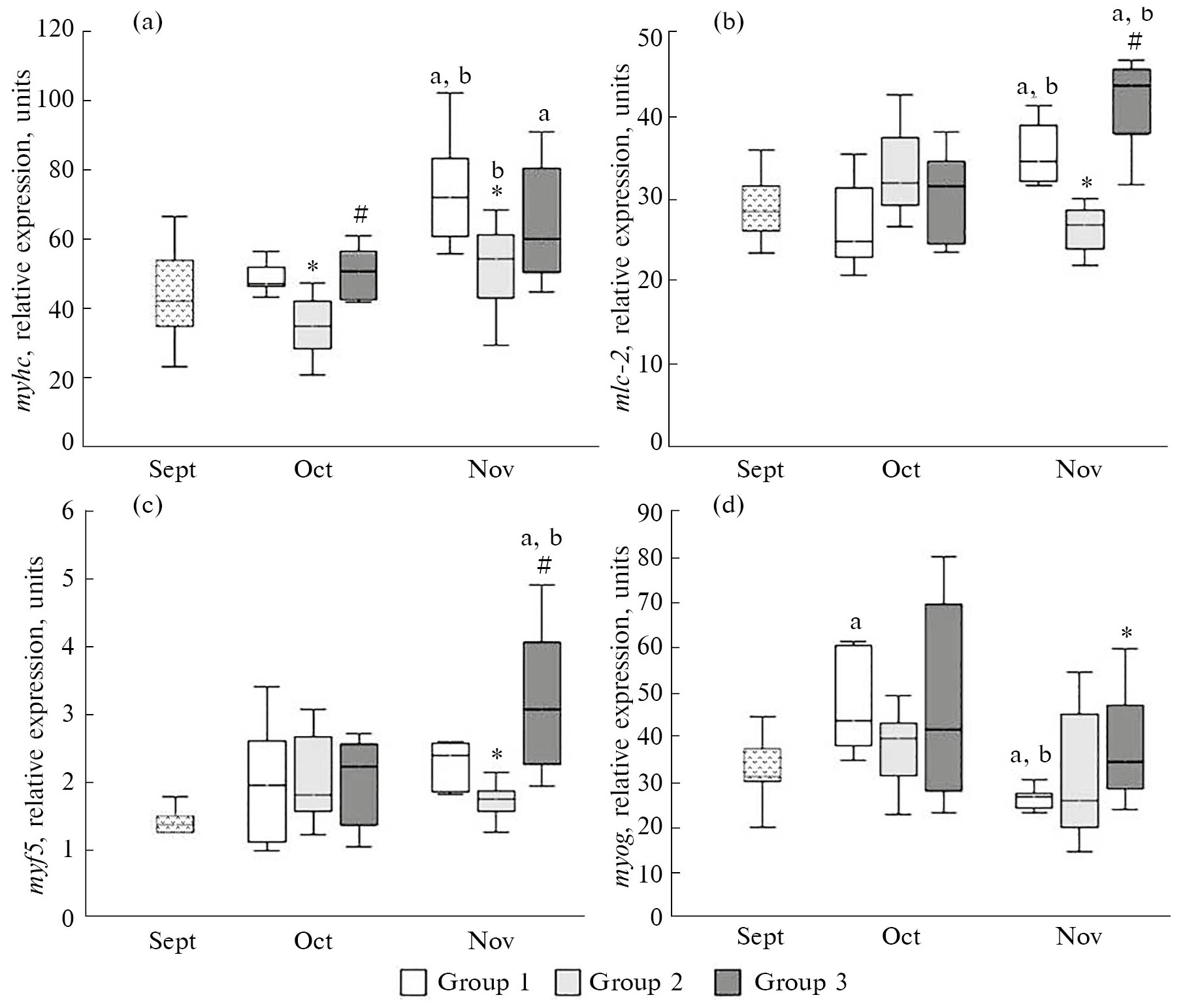 Установлены различия в экспрессии генов миогенных регуляторных факторов (МРФ). В ноябре уровень экспрессии гена myf5 был наименьшим в группе “ЕстФ КД” по сравнению с группами круглосуточного освещения (рис. 1c). Значение показателя увеличивалось к ноябрю только в группах с дополнительным освещением. Уровень экспрессии гена myog был выше в группе “24С КД” по сравнению с “24С КК” в ноябре (рис. 1d). За период исследования динамика показателя наблюдалась только в группе “24С КК”: в октябре значение увеличивалось по сравнению с предыдущим месяцем, а в ноябре – уменьшалось.