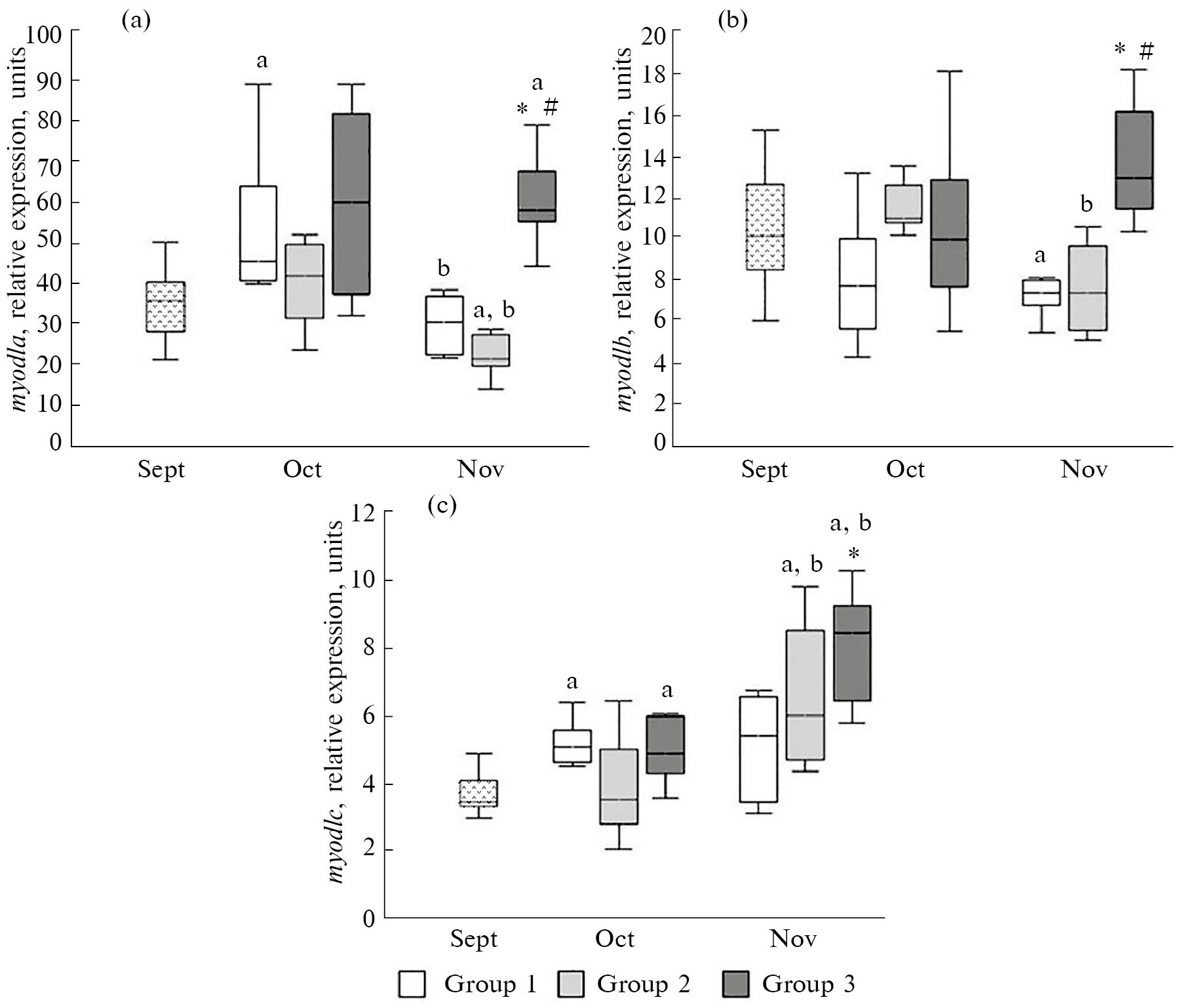 Наиболее высокие значения экспрессии генов всех трёх паралогов myod1 установлены в группе “24С КД” в ноябре (рис. 2). При этом межгрупповые различия для генов myod1a и myod1b выявлены по отношению к двум другим группам, а у myod1c только к группе “24С КК”. Динамика экспрессии генов паралогов myod1 в разных экспериментальных группах имела различный характер (рис. 2). В группе “24С КК” наблюдалось увеличение уровня экспрессии в октябре (myod1a, myod1с) и снижение в ноябре (myod1a, myod1b). В группе “ЕстФ КД” уровень экспрессии myod1a и myod1b в ноябре снижался по сравнению с предыдущим месяцем, а уровень myod1с повышался. В группе “24С КД” уровень экспрессии myod1a и myod1c увеличивался к ноябрю.