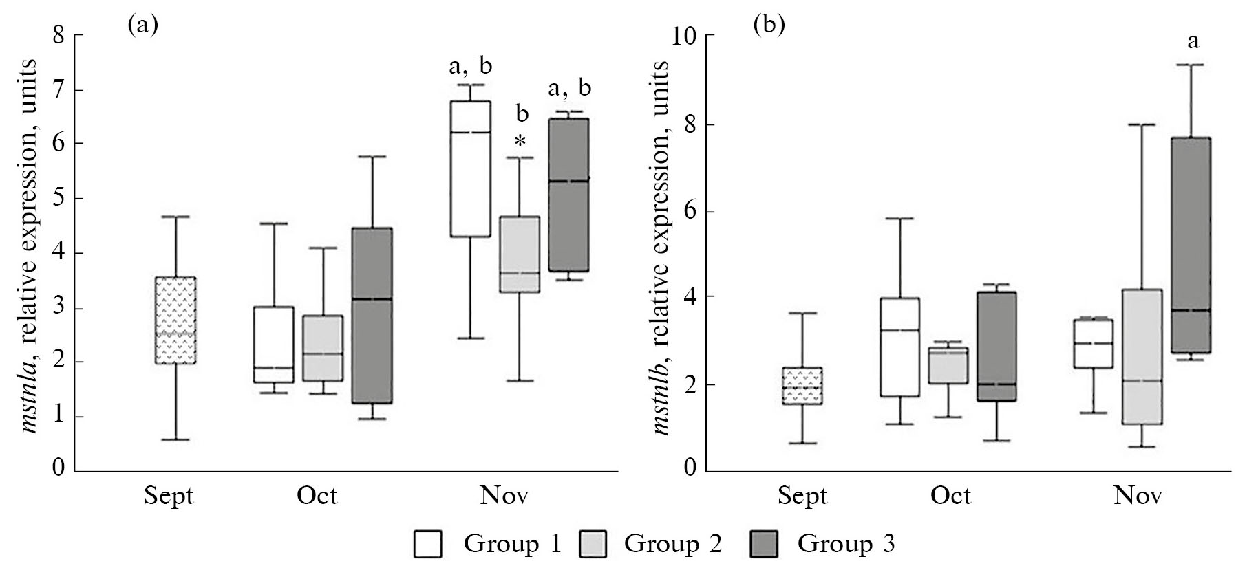 Рис. 3. Относительный уровень экспрессии генов (у. ед) mstn1a (a), mstn1b (b) в белых мышцах атлантического лосося, выращиваемого в группах с разными режимами освещения и кормления на протяжении периода исследования: сентябрь – значения до эксперимента; группа 1 – “24С КК” – режим освещения постоянный, кормление круглосуточное; группа 2 – “ЕстФ КД” естественный фотопериод, кормление в светлое время суток; группа 3 – “24С КД” – режим освещения постоянный, кормление в светлое время суток. Различия достоверны при p < 0.05 (критерий Краскела–Уоллиса, критерий Манна–Уитни с поправкой на множественное сравнение): * – в сравнении с группой 1, a – по сравнению со значениями в сентябре, b – по сравнению со значениями в октябре в соответствующей группе.