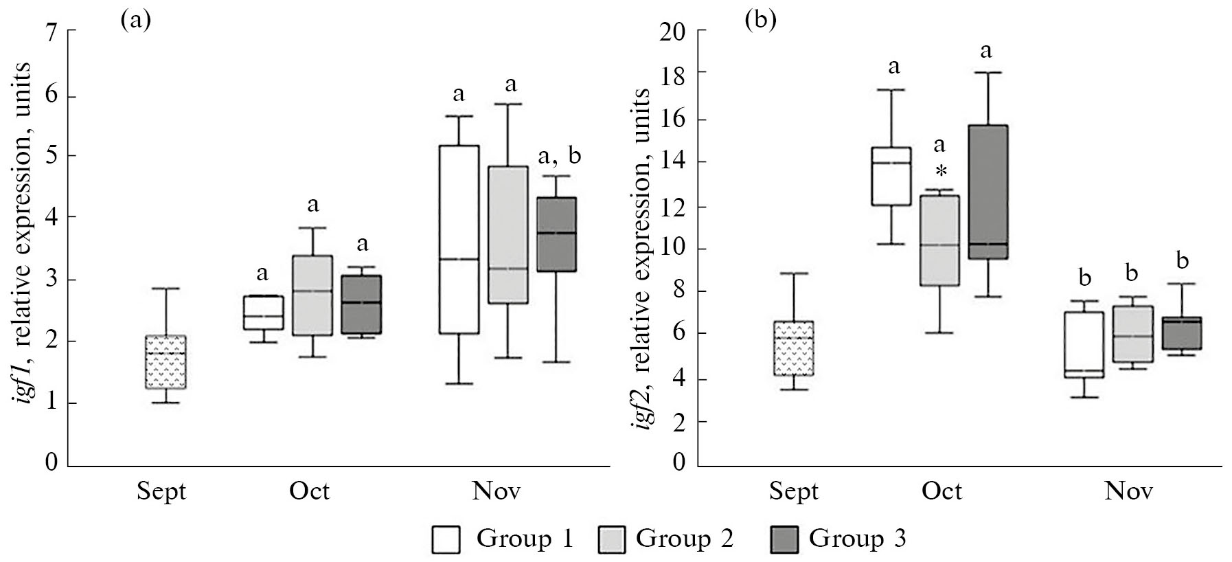 Среди генов igf зафиксирована межгрупповая разница только у igf2 (рис. 4b), согласно которой уровень экспрессии гена igf2 в мышцах рыб в октябре был ниже в группе “ЕстФ КД” по сравнению с группой “24С КК”. Также следует отметить, что экспрессия генов igf по-разному изменялась на протяжении эксперимента (рис. 4). Уровень экспрессии гена igf1 увеличивался постепенно к ноябрю, а гена igf2 – сначала увеличивался, затем уменьшался в ноябре, одинаково во всех исследуемых группах.
