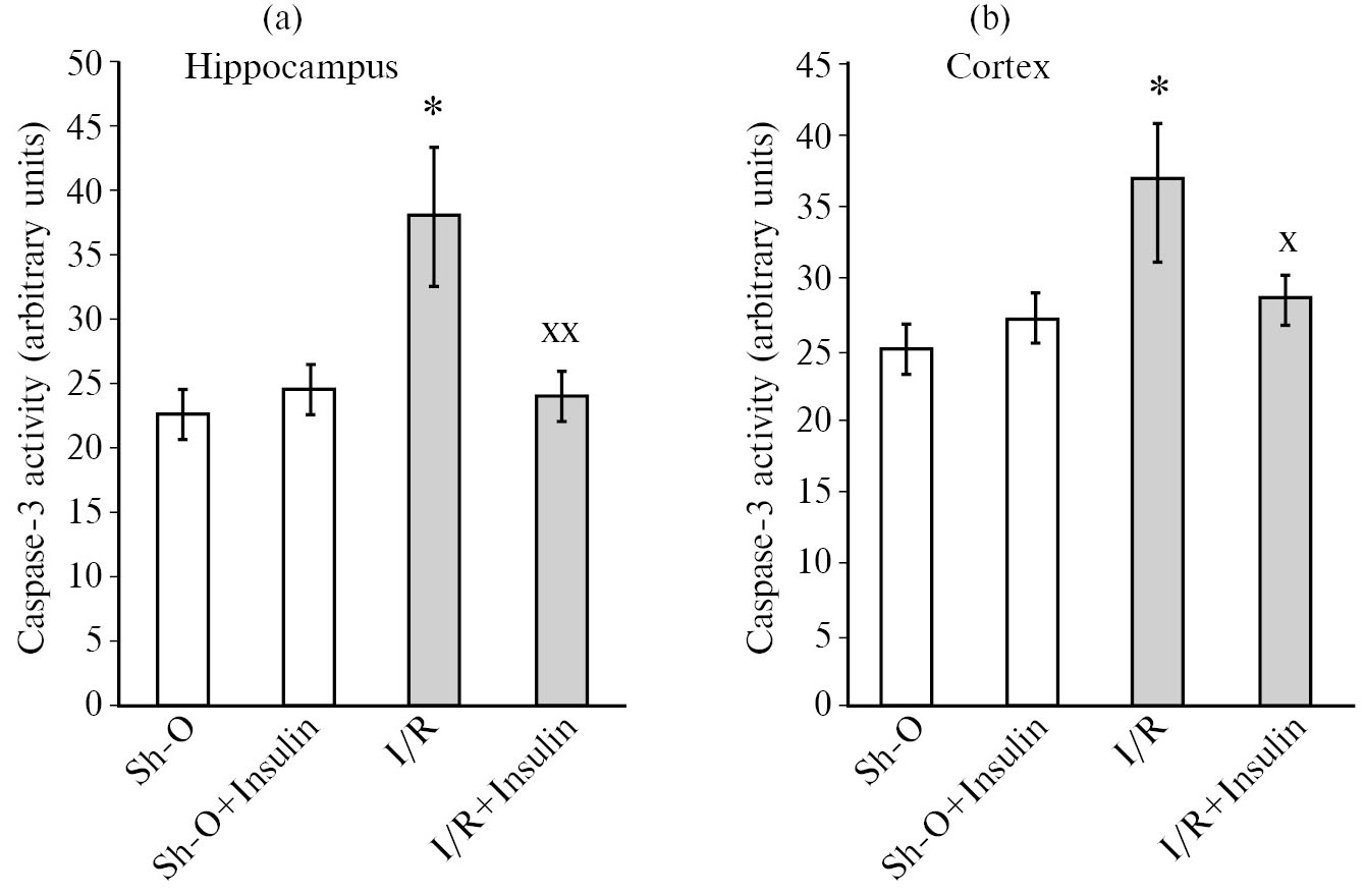 Рис. 2. Влияние введения инсулина на активность каспазы‑3 в гиппокампе и лобной коре мозга при ишемии и реперфузии переднего мозга крыс. Данные показаны как среднее ±SEM из 7–8 опытов. (a) – активность каспазы‑3 в гиппокампе, (b) – активность каспазы‑3 в лобной коре мозга. Расшифровка сокращений на рисунке и другая информация приведены в легенде к рис. 1. Различия достоверны по t критерию Стьюдента: * – по сравнению с данными, полученными в том же районе мозга ложно-оперированных крыс, p<0.02, x и xx – по сравнению с данными, полученными в том же районе мозга крыс с ишемией и реперфузией переднего мозга, x – p<0.05, xx – p<0.02.