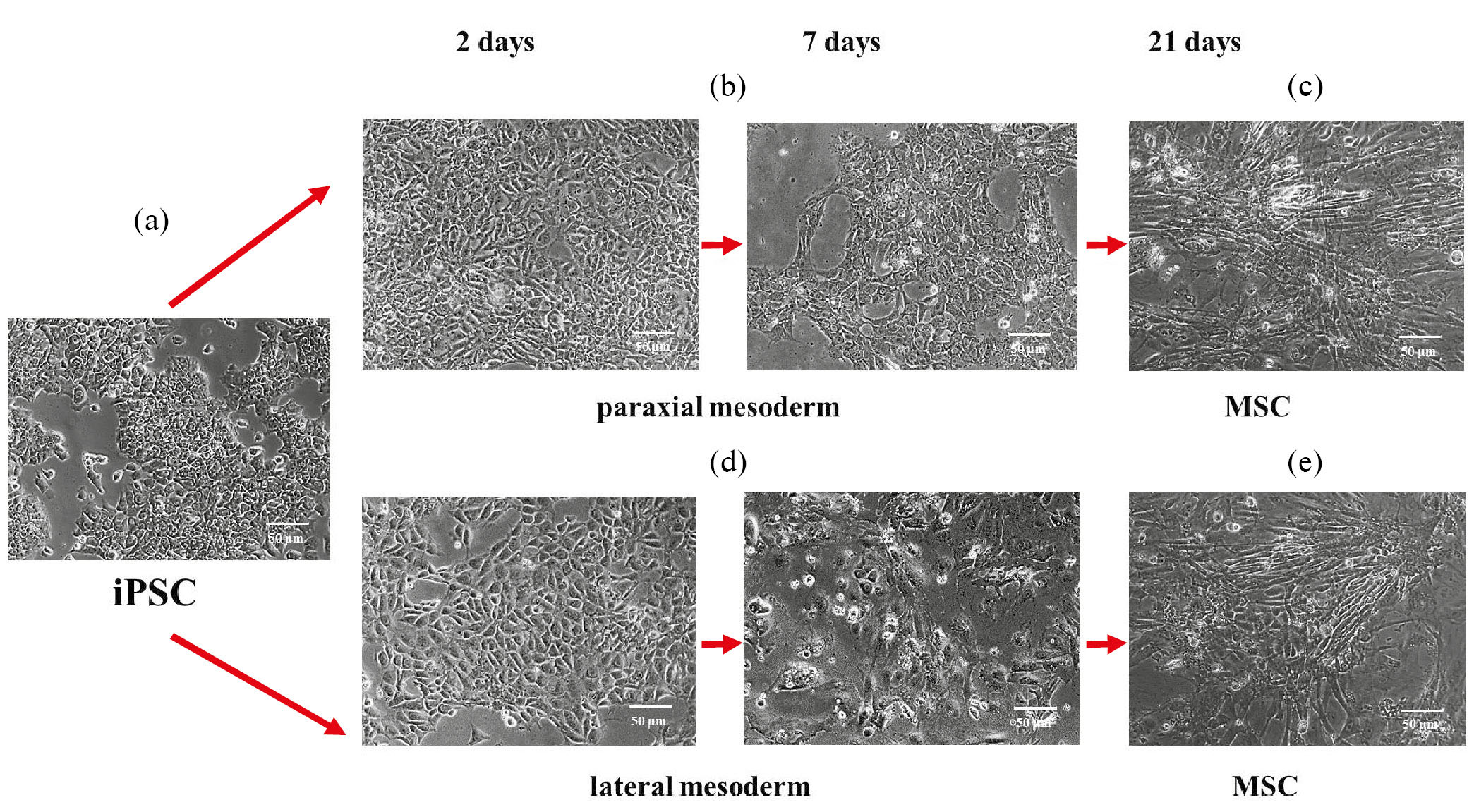 В настоящее время разработано множество стратегий спонтанной и направленной дифференцировки ИПСК человека в специализированные клетки трех зародышевых листков [38, 39, 40]. При мезодермальной дифференцировке ИПСК была продемонстрирована возможность получения как гемопоэтических клеток, так и различных типов популяций стромальных мезенхимальных клеток, включая МСК, кардиомиоциты, теноциты, хондроциты [41–46].