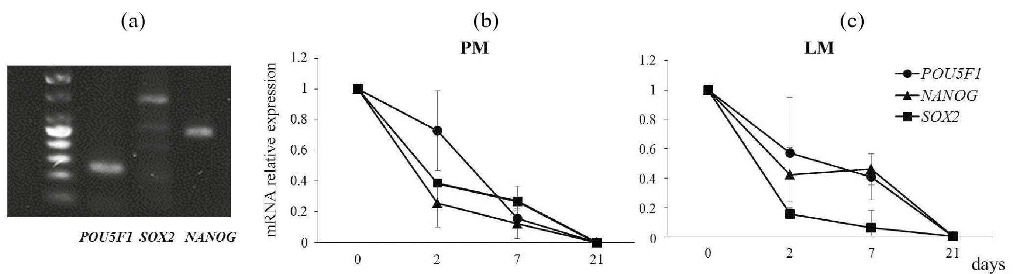 Клетки исходной культуры ИПСК экспрессировали гены плюрипотентности POU5F1, SOX2, NANOG (рис. 2а). В процессе дифференцировки уровень экспрессии этих генов в клетках ЛМ и ПМ, значительно снижался к 7 дню культивирования относительно исходной культуры ИПСК. К 21 дню культивирования в МСК экспрессия этих генов не обнаруживалась (рис. 2b, c).