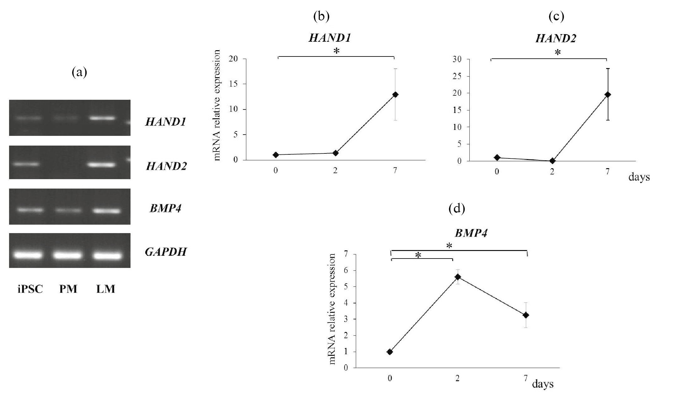 Рис. 4. Экспрессия генов HAND1, HAND2, BMP4 в клетках ЛМ, дифференцированных их ИПСК. (а) – уровень экспрессии генов в ИПСК, клетках ЛМ и ПМ на 7-й день культивирования. Электрофореграмма продуктов ПЦР. Изменение экспрессии генов HAND1 (b), HAND2 (c), BMP4(d) в процессе дифференцировки ИПСК в ЛМ. Представлены средние величины и их ошибки 3 независимых экспериментов. Звездочка показывает достоверность различий при p < 0.05. iPSC – индуцированные плюрипотентные стволовые клетки. PM – параксиальная мезодерма. LM – латеральная мезодерма.