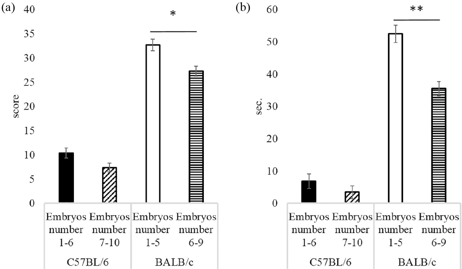 Рис. 3. (a) – Количество подходов к образцам мочи самцов в зависимости от количества эмбрионов в их потомстве. (b) – Время обнюхивания образцов мочи самцов в зависимости от количества эмбрионов в их потомстве. HSD-test * – p < 0.05, ** – p < 0.01