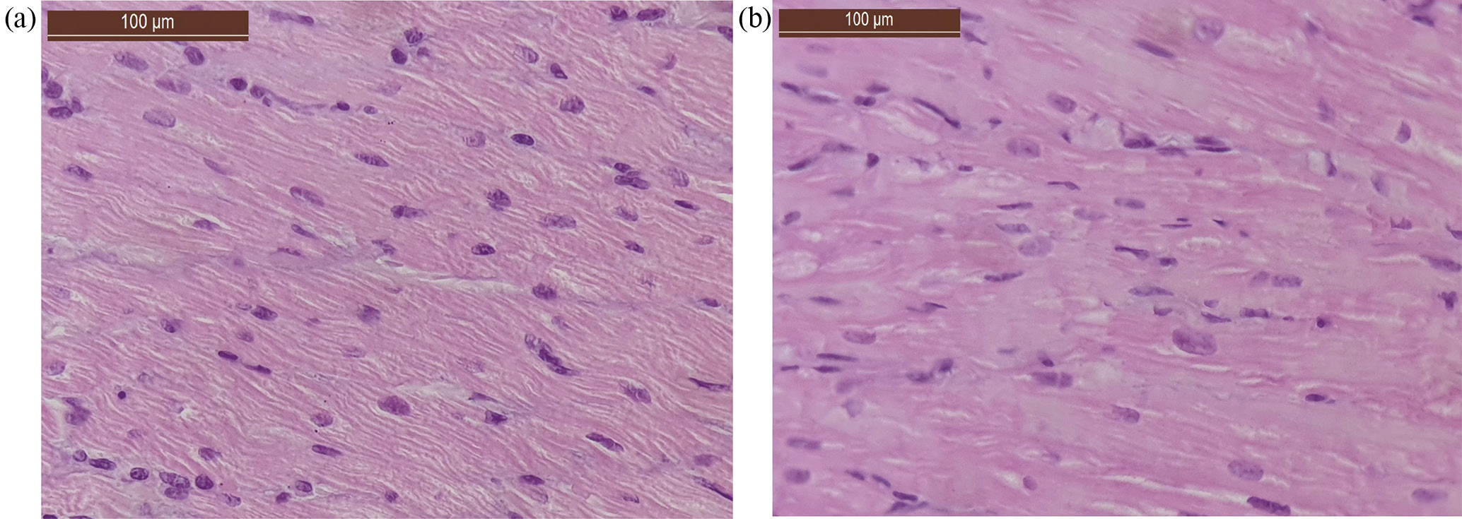 Рис. 1. Репрезентативные фотографии сердца животных экспериментальных групп. (a) – контроль; (b) – ДОКС. Окраска гематоксилином-эозином, ×200.