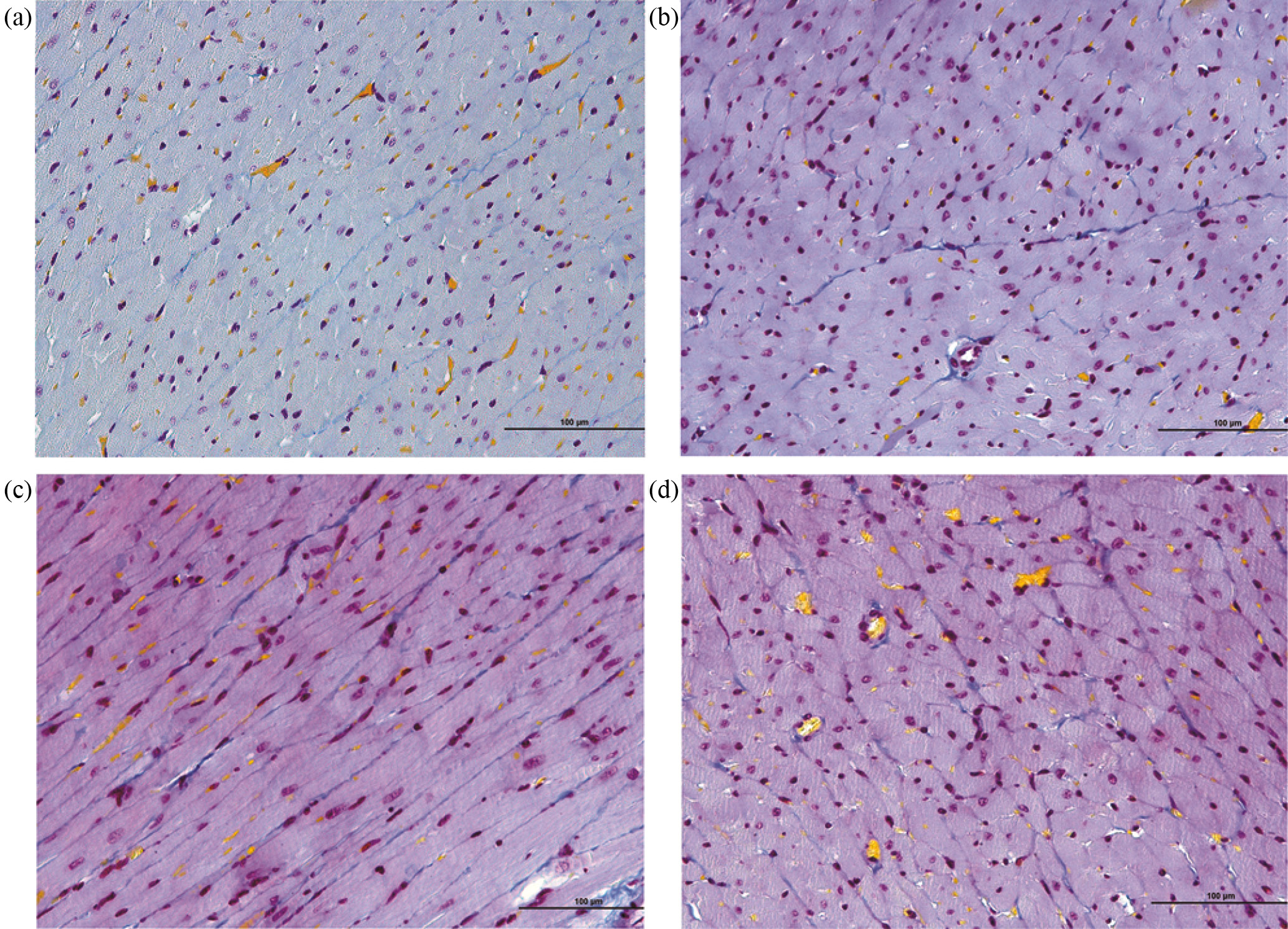 Рис. 2. Репрезентативные фотографии сердца (интерстициальная зона) животных экспериментальных групп. Синим цветом окрашены коллагеновые волокна. (a) – контроль; (b) – ДОКС; (c) – НР+ДОКС; (d) – НР/НР+ДОКС. Окраска по Маллори, ×200.