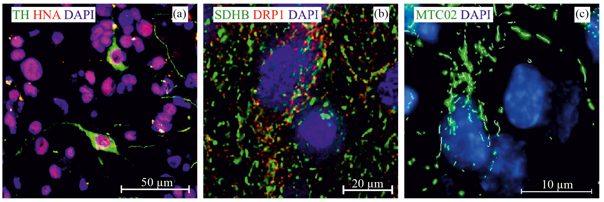 (a) — выявление тирозингидроксилазы (TH, зеленым) и ядерного антигена человека (HNA, красным), 6 месяц после трансплантации; (b) — ассоциация митохондриальной сети и Drp1 (SDHB — зеленым, Drp1 — красным), 6 месяц после трансплантации, изображение получено методом деконволюции из 24 фокальных планов; (c) — выявление наружной мембраны митохондрий (MTC02, зеленым) и результат работы алгоритма выделения срединной оси объектов (белым), 2 неделя после трансплантации, изображение получено с помощью медианного фильтра из 12 фокальных планов.