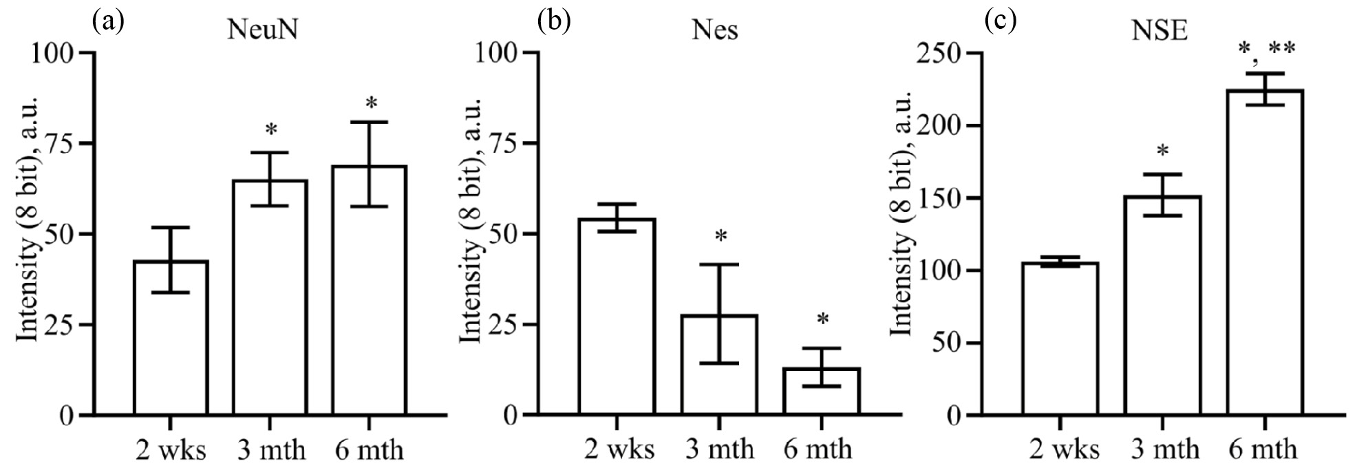 (а) — интенсивность флуоресценции (8 бит, градации яркости) при выявлении ядерного белка нейронов (NeuN); (b) — интенсивность флуоресценции (8 бит, градации яркости) при выявлении нестина (Nes); (c) — интенсивность иммунопероксидазного окрашивания (8 бит, градации яркости) при выявлении нейрональной енолазы (NSE).