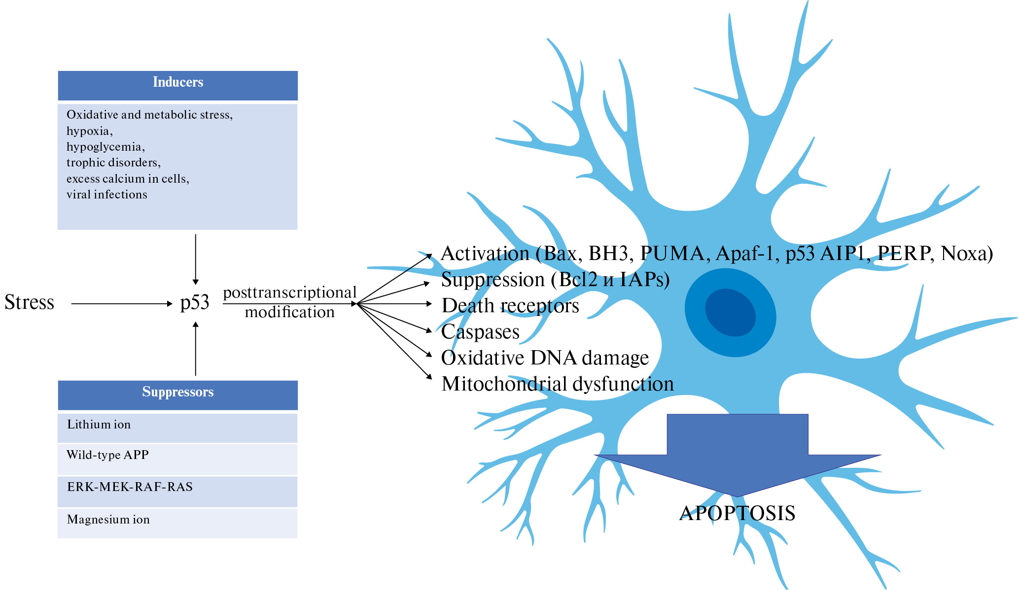 Фактор транскрипции и супрессор опухолей р53 — тетрамерный фосфопротеин, который управляет рядом основных клеточных функций, включая транскрипцию генов, синтез и репарацию ДНК, регуляцию клеточного цикла, старение и гибель клеток. Этот белок является одним из ключевых модуляторов реакции клеток на стресс, активация которого запускает апоптоз в различных типах клеток, в число которых входят и нейроны. Р53 относится к обширному семейству генов, таких как р63 и р73. Все они имеют много общего: ключевые функциональные домены, включая N-концевой домен трансактивации, C-концевой домен олигомеризации и консервативный ДНК-связывающий домен. При сверхэкспрессии р63 и р73 могут брать на себя часть функций р53, активируя те же гены-мишени и индуцируя апоптоз. Однако их роль в апоптозе нейронов до конца не ясна. В отличие от р53, который не играет явной роли в нормальном развитии, р63 необходим для развития некоторых тканей, например, эпителия, а р73 функционирует преимущественно в центральной нервной системе (ЦНС), в укороченной форме p73b выполняя антиапототическую функцию. При обсуждении роли р53 в гибели клеток головного мозга важно различать апоптоз, возникающий в ответ на повреждение или травму, и гибель клеток, происходящую во время нейрогенеза и в норме во взрослом мозге [19].