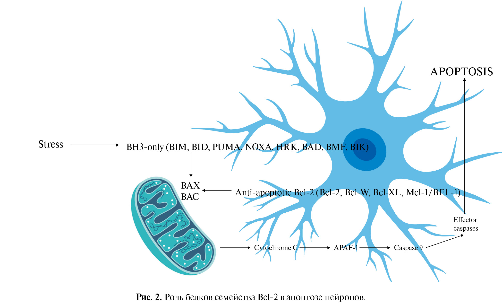 Функционально их можно разделить на антиапоптотические, проапоптотические и дивергентные (BH3). Проапоптотические Bax-подобные белки создают поры во внешней мембране митохондрий, что приводит к высвобождению цитохрома с в цитоплазму, активации каспаз и, далее, к гибели клеток (рис. 2). Антиапоптотические белки, как Bcl-2, связывают и ингибируют подмножество доменов BH3, непосредственно вызывая олигомеризацию Bax или BAK. Группа BH3 объединяет белки со слабовыраженной гомологией последовательностей по сравнению с Bcl-2 [47]. Многие из этих белков широко распространены и экспрессируются в нервной системе развивающихся и взрослых организмов.