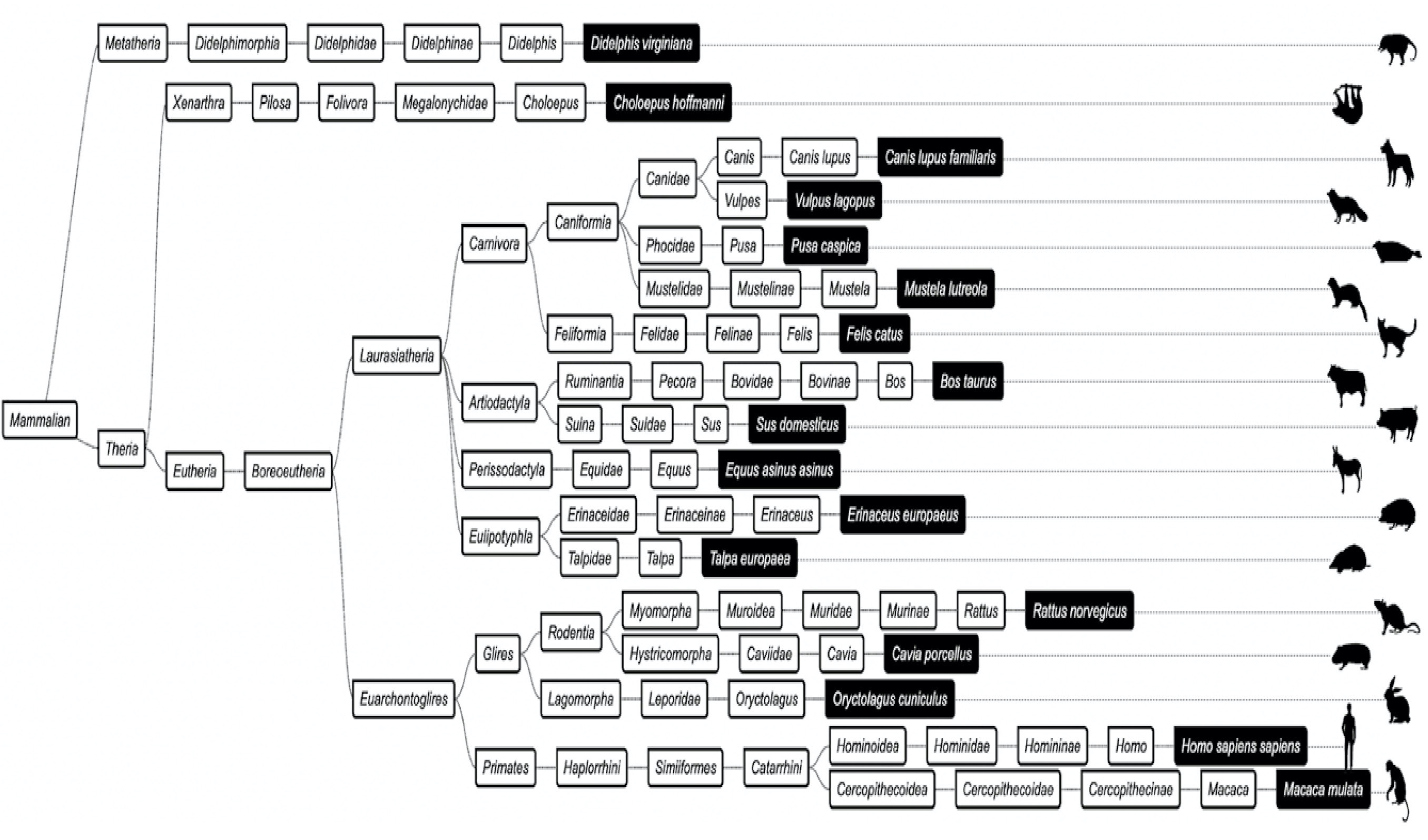 Таксономия видов, рассматриваемых в метанализе, по [27] приведена на рис. 1. Скелетотопия взрослых животных была взята из следующих источников: европейский ёж (Erinaceus europaeus) — [15], европейский крот (Talpa europaea) — [28], крыса-пасюк (Rattus norvegicus) — [29], морская свинка (Cavia porcellus) — [16], домашняя собака (Canis lupus familiaris) и дикий кролик (Oryctolagus cuniculus) — [30], домашняя кошка (Felis catus) — [6], европейская норка (Mustela lutreola) и песец (Vulpes lagopus) — [31], каспийская нерпа (Pusa caspica) — [32], домашняя свинья (Sus domesticus) — [33], домашний осёл (Equus asinus asinus) — [2], домашний бык (Bos taurus) — [34], двупалый ленивец (Choloepus hoffmanni) — [35, 36], виргинский опоссум (Didelphis virginiana) — [37], макак-резус (Macaca mulatta) — [38], человек разумный (Homо sapiens sapiens) — [39, 40]. Скелетотопия новорождённых животных была взята из следующих источников: домашняя кошка (Felis catus) — [7], европейская норка (Mustela lutreola) и песец (Vulpes lagopus) — [31], человек разумный (Homо sapiens sapiens) — [41].