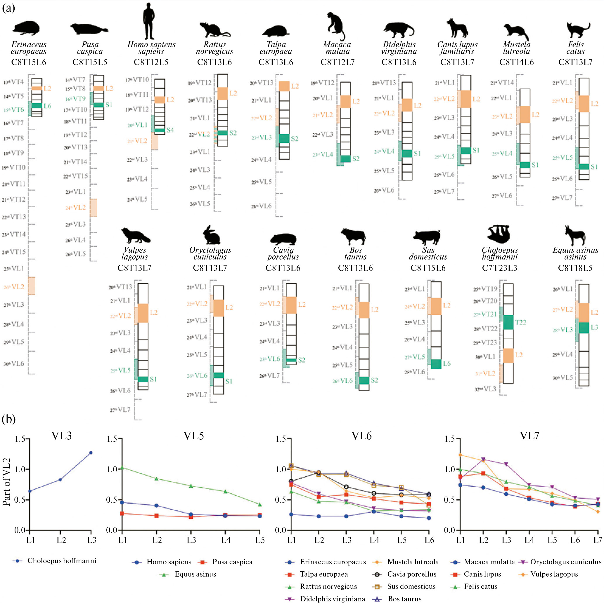 Рис. 2. Скелетотопия (a) и относительная длина (b) сегментов поясничного отдела спинного мозга взрослых животных для видов, использованных в метаанализе. На (а) для каждого вида указано число шейных, грудных и поясничных сегментов; слева пунктиром обозначены позвонки с нумерацией их по отделам (VT4–VL7) и непрерывной нумерацией, начиная от первого шейного позвонка (13th-32nd); светло-зелёным обозначен позвонок, в котором находится 29-й сегмент спинного мозга. Масштаб выбран так, чтобы длина позвонка VL2 (обозначен светло-оранжевым), используемого для нормировки, была одинаковой для всех видов. Черными прямоугольниками обозначены сегменты спинного мозга, сегмент L2 обозначен ярко-оранжевым, а 29-й сегмент – ярко-зелёным. Виды животных упорядочены по степени восхождения 29-го сегмента спинного мозга. На (b): Отношение длин поясничных сегментов к длине позвонка VL2. На каждом графике представлены виды животных с равным количеством поясничных позвонков (VL3, VL5–VL7). L – поясничный сегмент, part of VL2 – доля от длины позвонка VL2.