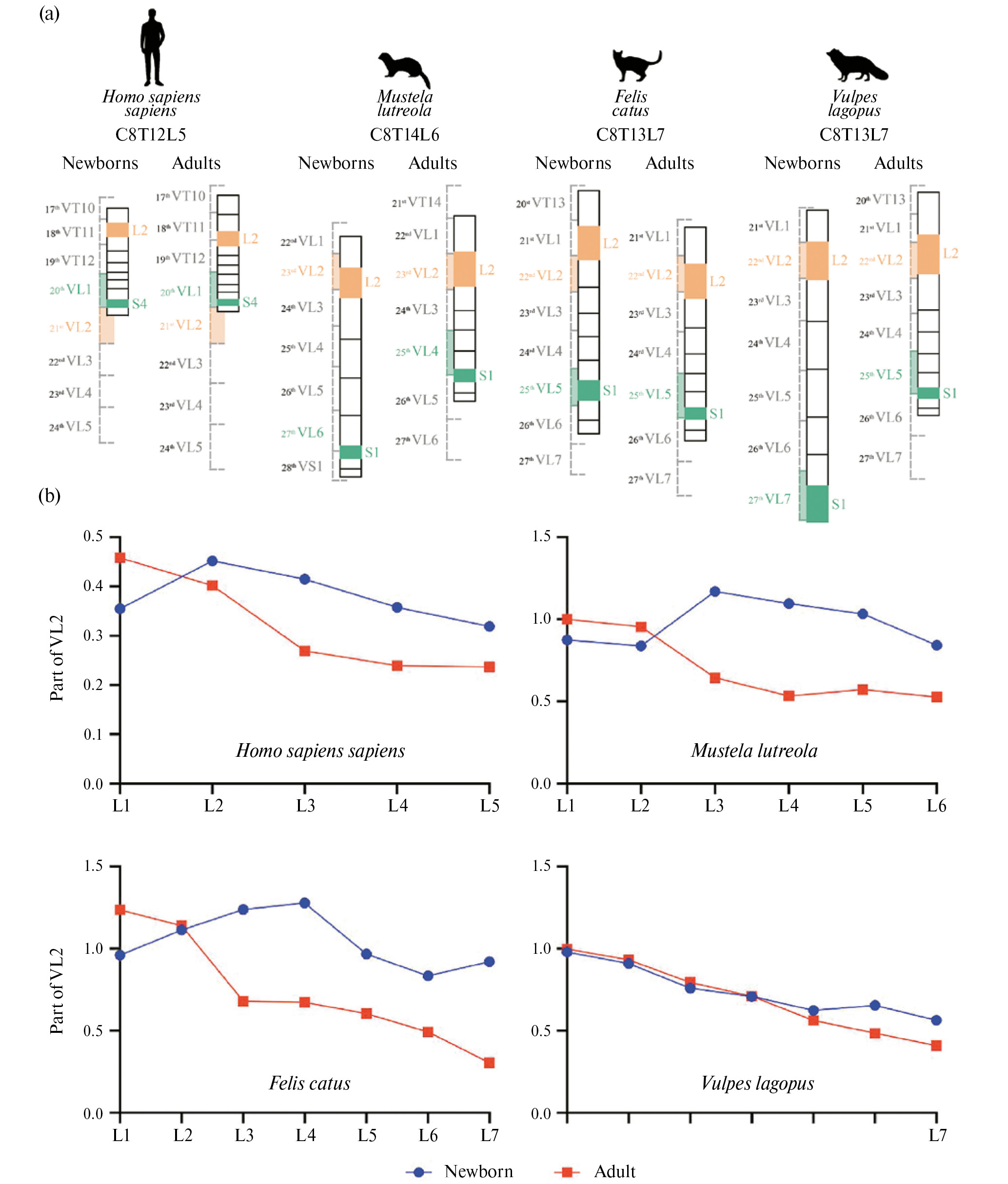 Сравнительная скелетотопия новорожденных и взрослых животных приведена на рис. 3a. У человека и кошки восхождение, по-видимому, в значительной степени завершено пренатально: у новорожденных детей 29-й сегмент (S4) уже находится в позвонке VL1, у котят 29-й сегмент (S1) уже находится в позвонке VL5. Между тем, у норки и песца 29-й сегмент (S1) восходит от границы между позвонками VL6–VS1 до границы между позвонками VL4–VL5 и от позвонка VL7 до позвонка VL5 соответственно. У кошки постнатально нисходят все поясничные сегменты (L1–L7), у человека наблюдается незначительное нисхождение сегментов L1 и L2. Из рис. 3b видно, что новорожденные животные в большей степени отличаются от взрослых по относительной длине нижних поясничных, но не верхних поясничных сегментов СМ.