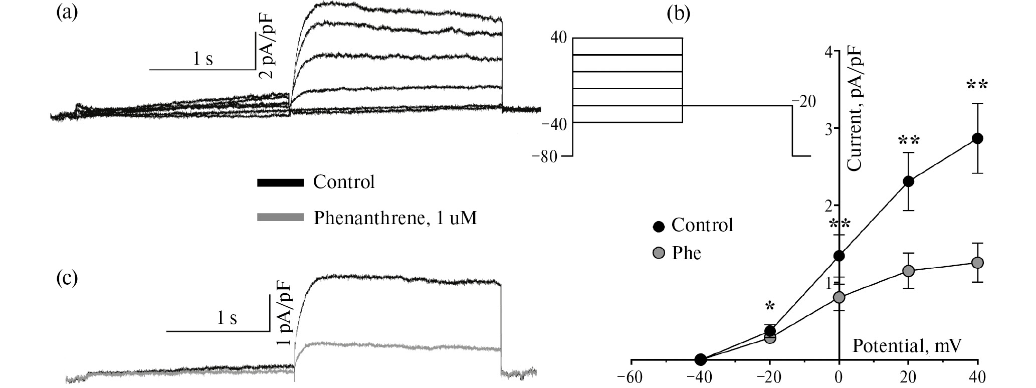 Изолированные кардиомиоциты (300 мкл суспензии изолированных клеток) помещали в экспериментальную камеру объемом 300 мкл, монтированную на инвертированном микроскопе Eclipse Ti-S (Nikon, Япония). Кардиомиоциты суперфузировали внеклеточным раствором, состав которого различался в зависимости от типа эксперимента, со скоростью около 1.5 мл/мин. Температуру раствора в камере поддерживали на уровне 7°С с помощью терморегулятора CL-100 с элементом Пельтье (Warner Instruments, США). Фенантрен в ходе экспериментов добавляли во внеклеточный раствор. Маточный раствор фенантрена (10 мМ) готовили на основе диметилсульфоксида (ДМСО) и использовали в течение 48 ч после приготовления. Концентрация ДМСО во внеклеточном растворе в каждом из экспериментов не превышала 1:1000. Пипетки вытягивали из боросиликатных стеклянных капилляров без филамента (World Precision Instruments, США) с помощью пуллера PC-100 (Narishige, Япония) и заполняли пипеточным раствором, состав которого также различался в зависимости от типа эксперимента. Сопротивление пипеток, заполненных раствором, составляло 2–3 МΩ. Ионные токи и потенциалы действия (ПД) регистрировали с использованием метода whole-cell пэтч-кламп с помощью усилителя Axopatch 200A (Molecular Devices, США). Сопротивление доступа и емкость клетки компенсировали перед непосредственной регистрацией ионных токов или потенциалов действия. Протоколы изменения потенциала указаны на соответствующих рисунках. Регистрацию тока начинали спустя 1 мин после установления whole-cell контакта с клеткой. Ток регистрировали в контрольных условиях в течение не менее чем 3 мин, после достижения стационарной амплитуды тока. При проведении эксперимента ток регистрировали в течение всего времени подачи фенантрена в экспериментальную камеру, эффект оценивали после выхода амплитуды тока на стационарный уровень.