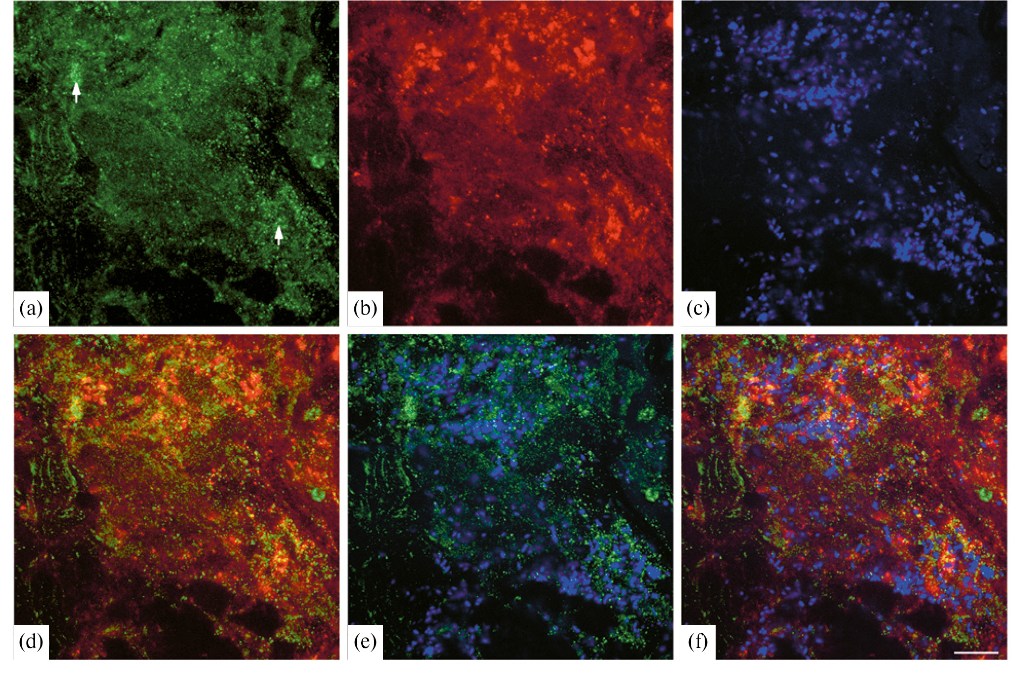 Рис. 3. Наличие Ca²⁺-кальмодулин зависимой протеинкиназы типа 2 при тройном флуоресцентном мечении препарата соматических мышечных клеток дождевого червя. (a) – Иммуномечение антителами к Ca²⁺-кальмодулин зависимой протеинкиназе типа 2 (зеленый цвет); (b) – иммуномечение антителами к пресинаптическому белку синаптофизину (красный цвет); (c) – мечение нАХР при помощи ТМР-α-Б (синий цвет); (d) – наложение изображений (a) и (b); (e) – наложение изображений (a) и (c); (f) – наложение изображений (a), (b) и (c). Масштаб 20 µm.