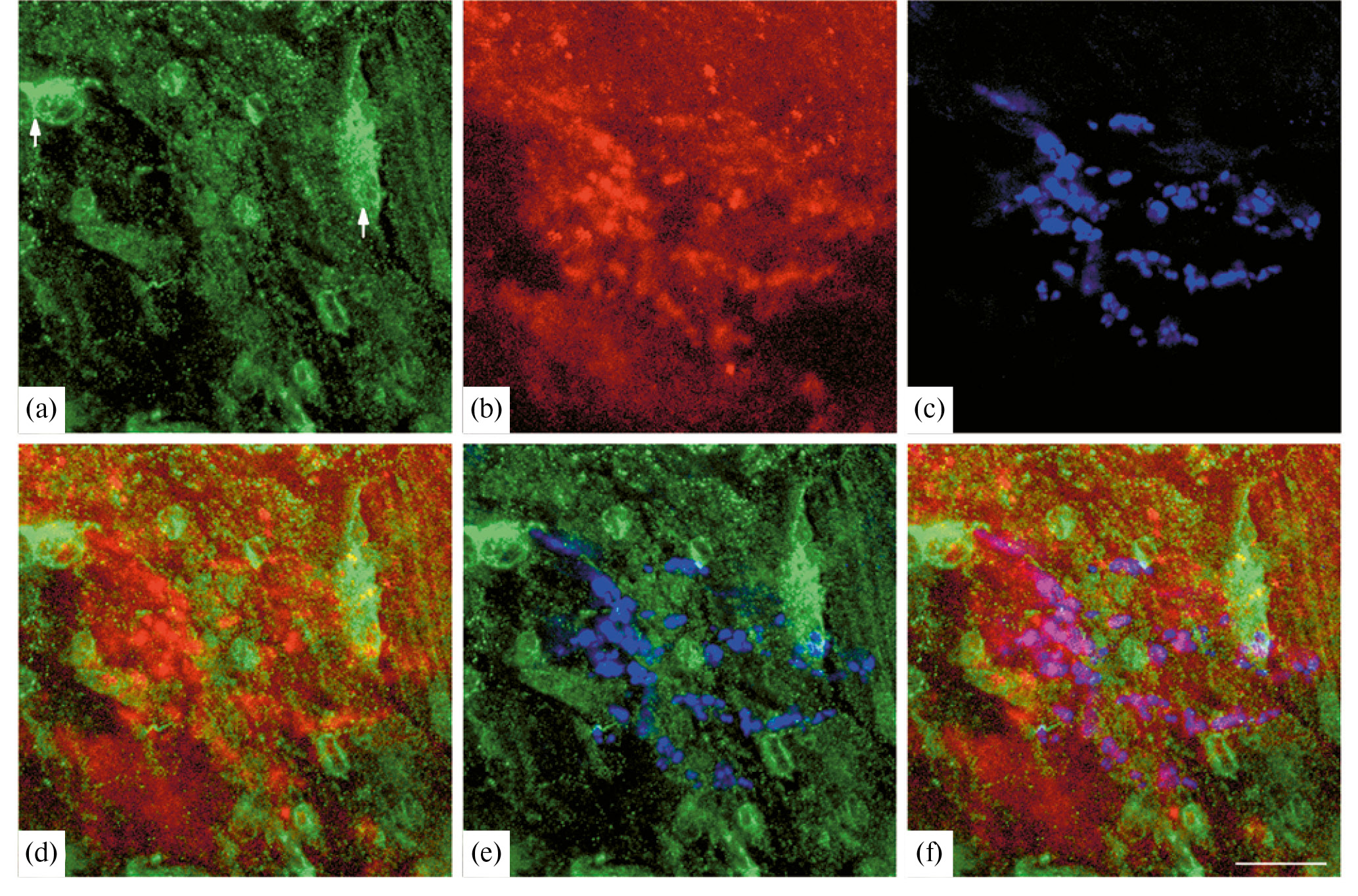Рис. 1. Флуоресцентное тройное мечение препарата соматических мышечных клеток дождевого червя Lumbricus terrestris. (a) — Иммуномечение антителами к кальмодулину (зеленый цвет); стрелки указывают на места более интенсивного мечения; (b) — иммуномечение антителами к пресинаптическому белку синаптофизину (красный цвет); (c) — мечение ТМР-α-Б постсинаптических нАХР (синий цвет); (d) — наложение изображений (a) и (b); (e) — наложение изображений (a) и (c); (f) — наложение изображений (a), (b) и (c). Масштаб 20 µm.