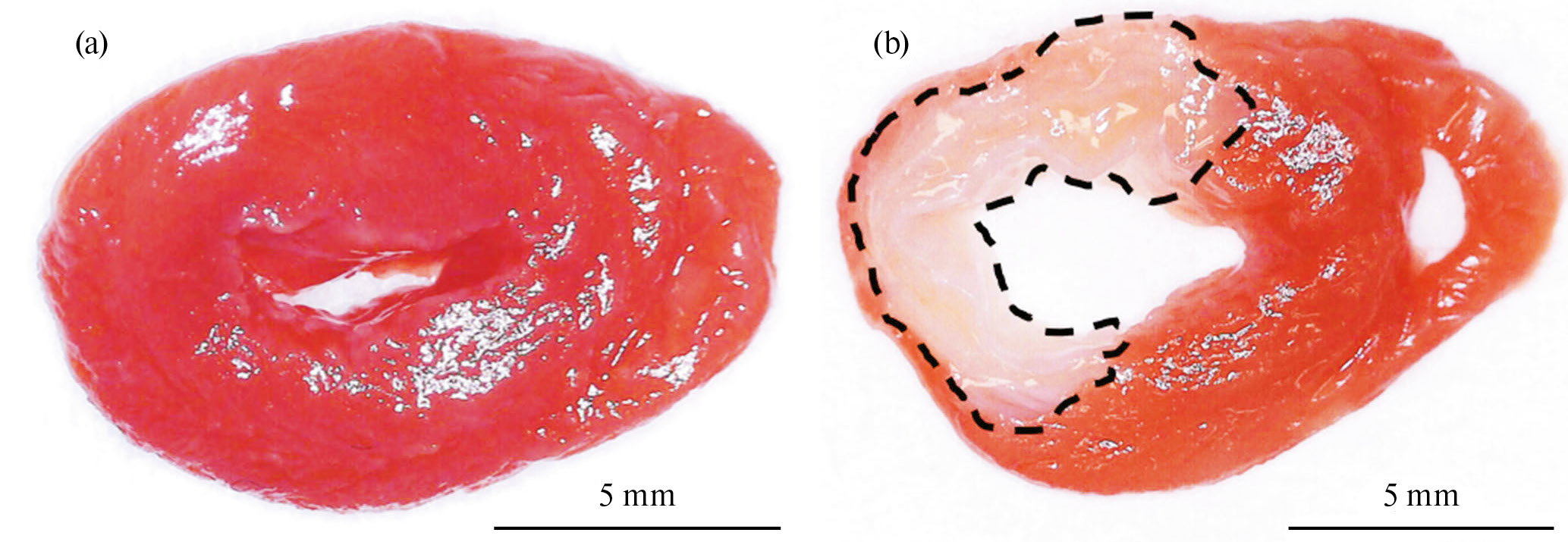 Рис. 2. Срезы сердец ЛО- (а) и ИР-крыс (b), окрашенные раствором трифенилтетразолия хлористого. Пунктиром обозначены границы рубцовой ткани.