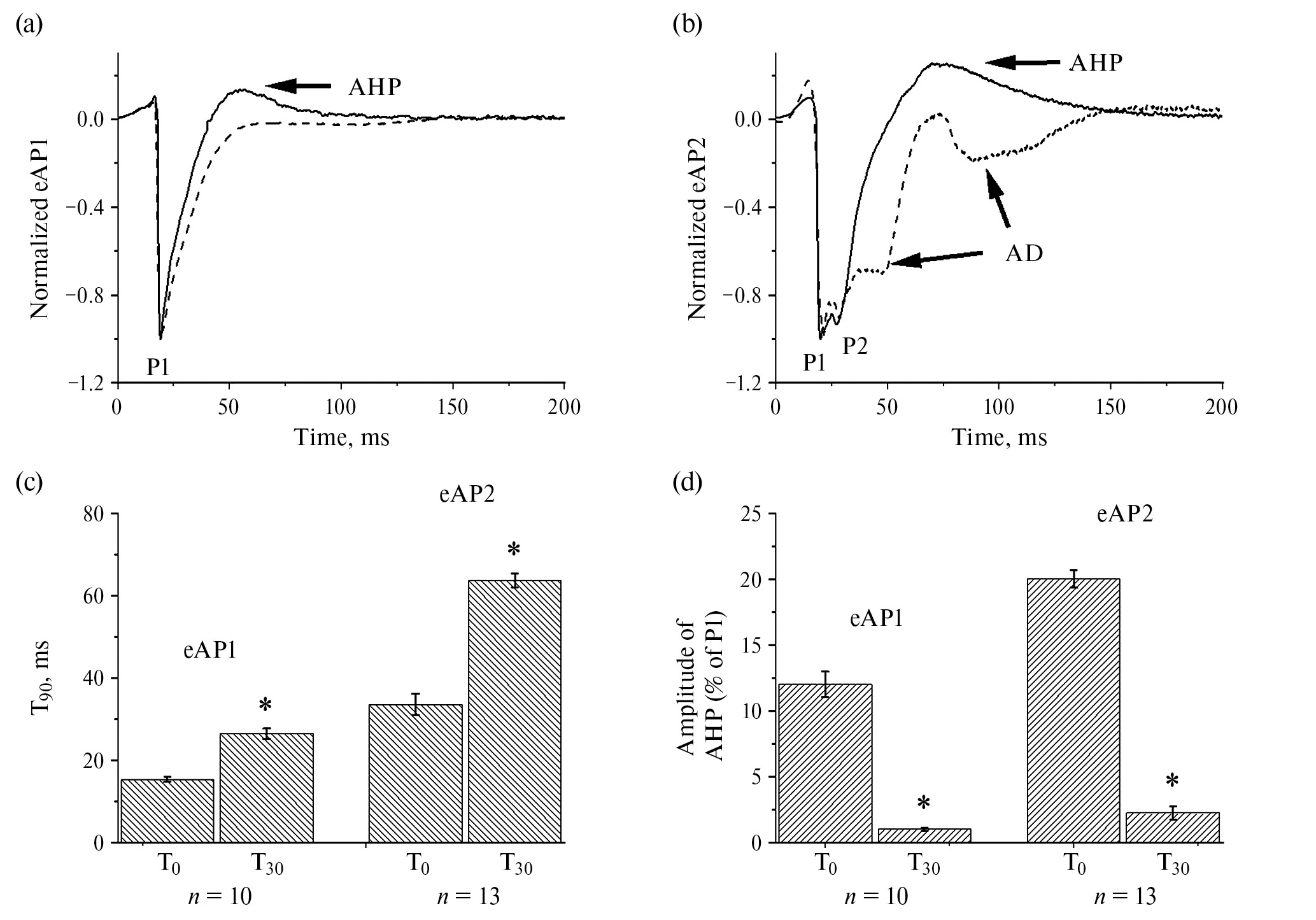 (с), (d) – средние значения T₉₀ вПД1 (eAP1) и вПД2 (eAP2) соответственно в начале (T₀) и через 30 минут (T₃₀) непрерывной регистрации (парный t-критерий Стьюдента, p > 0.05).