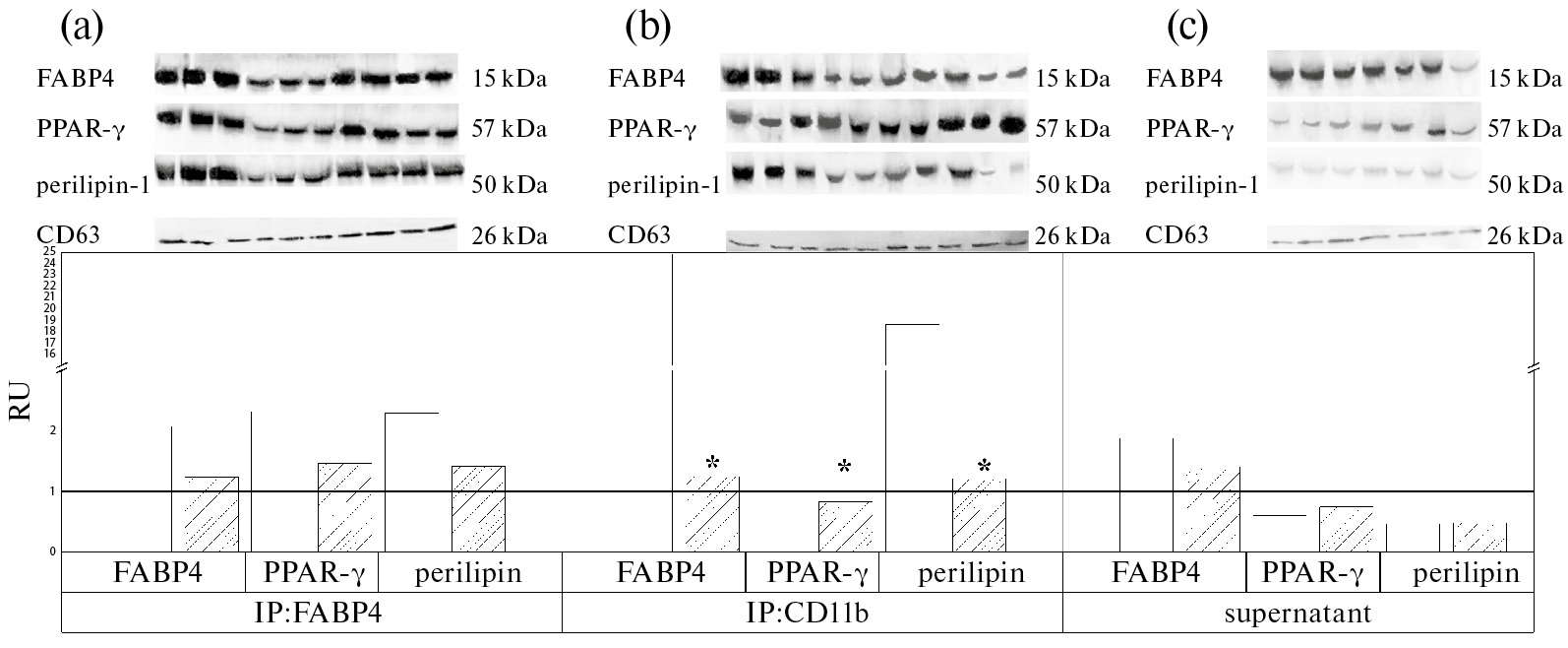 Рис. 3. Уровни FABP4, перилипина-1 и PPAR-ý во фракциях циркулирующих ВВ после иммунопреципитации ВВ на латексных частицах, покрытых антителами к FABP4 (a), к CD11b (b) и в супернатанте после удаления ВВ моноцитарно-макрофагального происхождения (c) у больных КРР без метаболических нарушений (светлые столбцы) и КРР с метаболическими нарушениями (штрихованные столбцы) по сравнению с больными с полипами толстой кишки с метаболическими нарушениями (CP). RU — условные единицы. Дорожки 1, 2, 3 — больные КРР без метаболических нарушений, 4-7 — больные КРР с метаболическими нарушениями, 8-10 — полипы толстой кишки с метаболическими нарушениями (3а, 3b). Дорожки 1, 2 — больные КРР без метаболических нарушений, 3-5 — больные КРР с метаболическими нарушениями, 6-7 — полипы толстой кишки с метаболическими нарушениями (3с). Вестерн блоттинг. * — различия достоверны по сравнению с группой больных КРР без метаболических нарушений, p < 0.05, n = 20.
