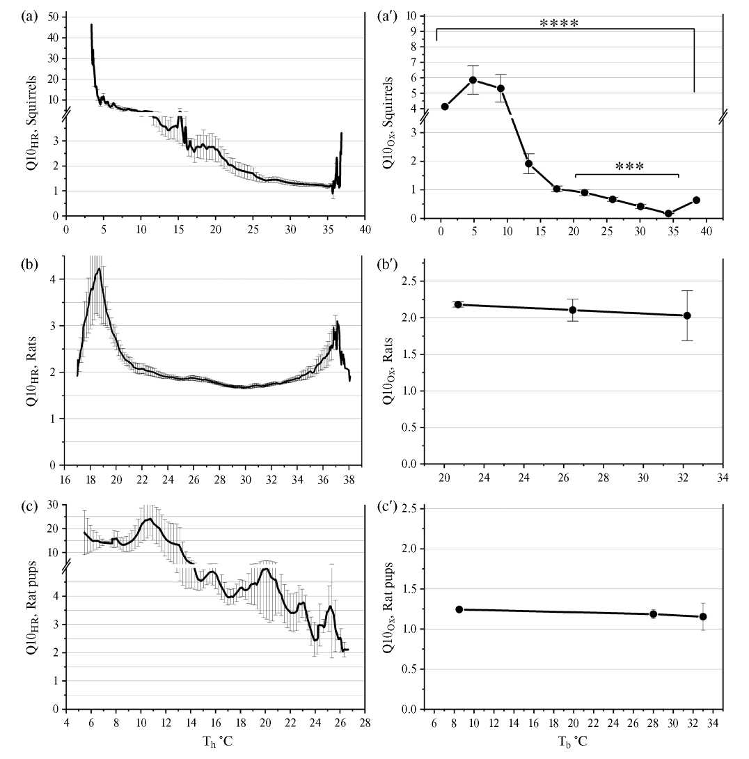Рис. 2. Зависимость коэффициентов Q10 от температуры. Представлена зависимость Q10HR от Th , а также зависимость Q10Ox от Tb Где: (а, a’) — спящие суслики, (b, b’) — взрослые крысы, (c, c’) –крысята. Значения представлены в форме Mean ± SEM, n = 5–10. Примечание: кривые a, b и c получены с использованием (3), тогда как кривые a’, b’ и c’ получены с использованием (2). Однофакторный тест ANOVA (программное обеспечение GraphPad Prism 8) показывает, что средние данные Q10Ox сусликов (a’) зависели от температуры: **** P < 0.0001. Зависимость от температуры наблюдалась также при анализе выделенного диапазона температур 20℃ — 35℃, когда значения находились в диапазоне 0 ≤ Q10Ox ≤ 1, *** p < 0.0005. У взрослых крыс и крысят (b’ и c’) величины Q10Ox статистически не завесили от температуры: p < 0.05