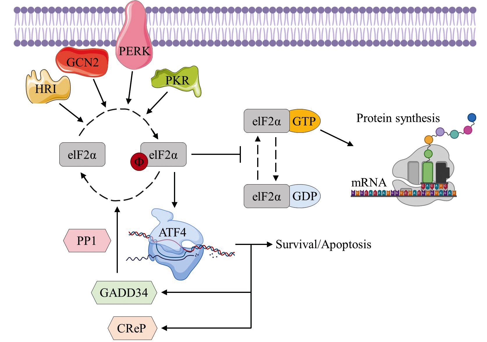 Рис. 1. Сигнальный путь интегрированного ответа на стресс (ИОС). PERK — PKR-подобная киназа эндоплазматического ретикулума; GCN2 — недерепрессируемая киназа общего контроля 2; PKR — протеинкиназа R; HRI — гем-регулируемая ингибиторная киназа; eIF2α — эукариотический фактор инициации трансляции 2α; ATF4 — активирующий транскрипционный фактор 4; GADD34 — регуляторная субъединица протеинфосфатазы 1 15а; PP1 — протеинфосфатаза 1; CReP — конститутивный репрессор фосфорилирования eIF2α; ГТФ — гуанозинтрифосфат; ГДФ — гуанозиндифосфат.