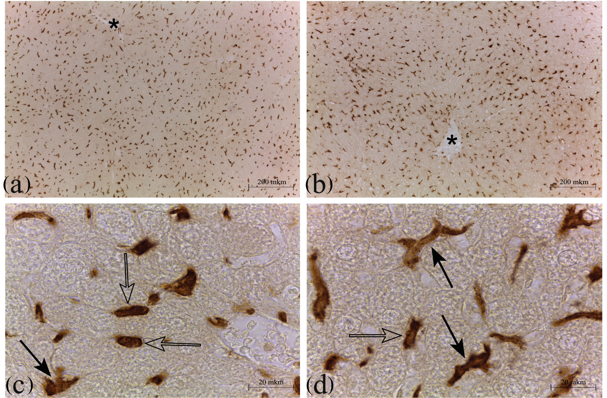 Рис. 1. Iba-1-иммунопозитивные структуры в препаратах печени: (a, с) — в печени крысы линии SHR, увеличение микроскопа х10 (a) и х100 (с); (b, d) — в печени крысы породы Wistar, увеличение микроскопа х10 (b) и х100 (d). Звездочка — центральная вена; закрашенная стрелка — клетки Купфера с выраженными цитоплазматическими отростками; прозрачная стрелка — клетки Купфера эллипсоидной формы. Объективы Plan 10х/0.22 (a; b); Plan 100x/1.25 (с; d).