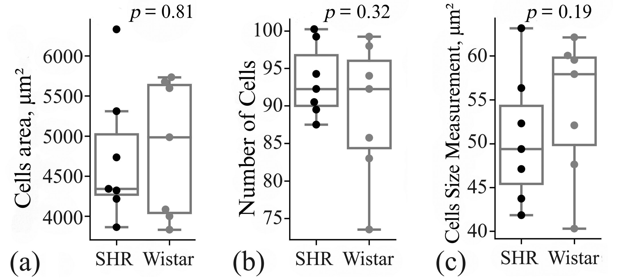 Рис. 3. Результат статистического сравнения Iba-1-иммунопозитивных структур двух групп (SHR n = 7; Wistar n = 7): (a) — общая площадь Iba-1-иммунопозитивных клеток; (b) — число выявленных структур в одном поле зрения; (с) — размер клеток Купфера и их фрагментов. Линия внутри бокс-плота отображает медиану (Ме) распределения иммунопозитивных структур.
