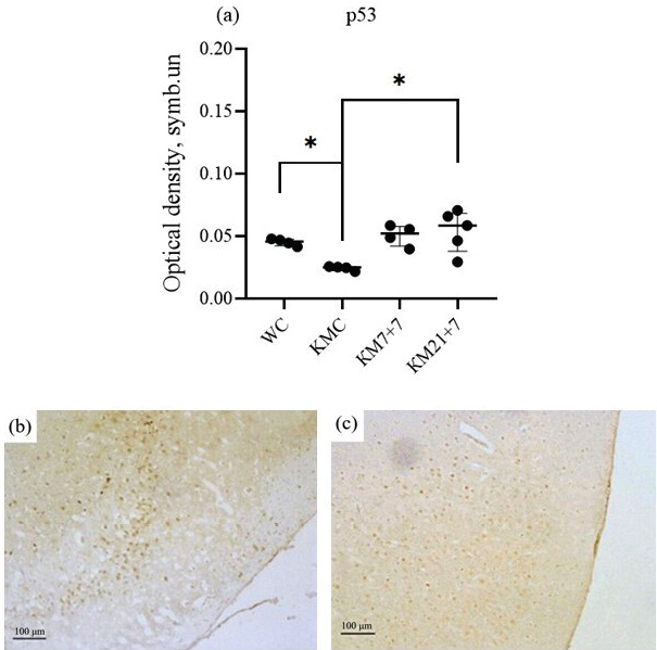 Рис. 2. (a) – Сравнение уровня p53 в коре височной доли мозга у экспериментальных животных (ИГХ); (b) – Кора височной области крысы из группы WC. ИГХ с антителами к p53, х200; (c) - Кора височной области крысы из группы KMC. ИГХ с антителами к p53, х200. WС – контрольная группа крыс линии Вистар, KMC – контрольная группа крыс линии КМ, KM7+7 – экспериментальная группа крыс, с которыми производили киндлинг в течение 7 дней + 7 дней покоя, KM21+7 – экспериментальная группа крыс, с которыми производили киндлинг в течение 21 дня+ 7 дней покоя.
