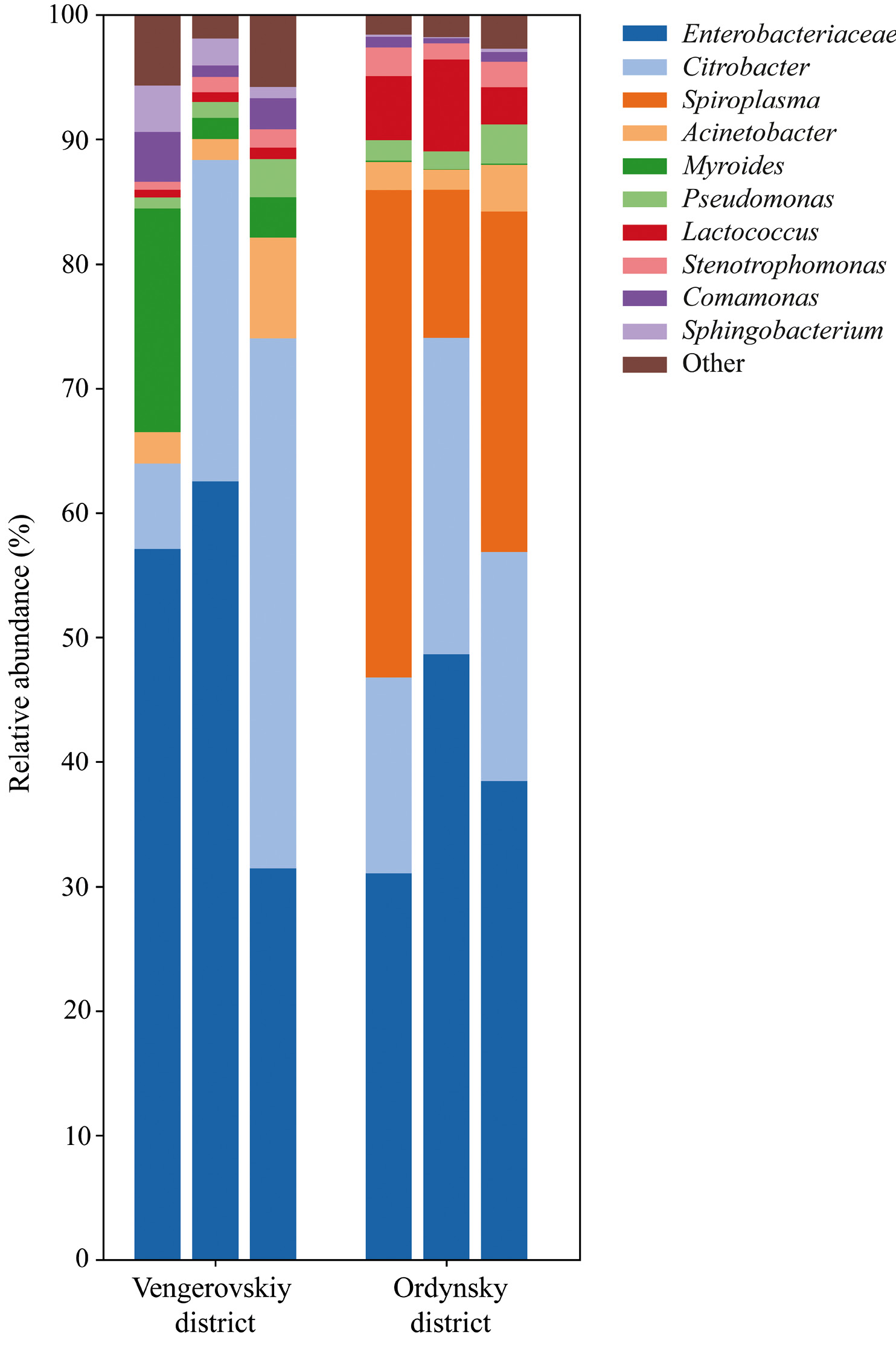 Рис. 1. Относительное обилие (%) бактерий в сообществах кишечной микробиоты колорадского жука из двух географических точек Новосибирской области (Венгеровский и Ордынский районы). Отображена встречаемость бактерий для трех биологических повторов (5 насекомых в каждой повторности).