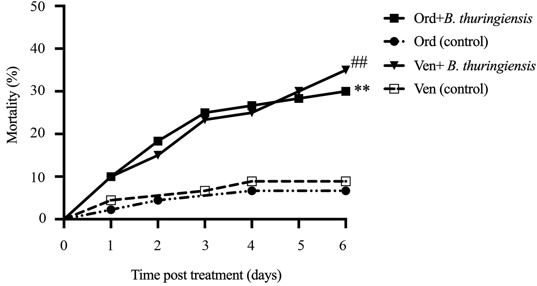 Рис. 2. Смертность личинок колорадского жука из двух географических точек Новосибирской области Ордынский район (Орд) и Венгеровский район (Вен) после перорального заражения споро-кристаллической смесью B. thuringiensis ssp. morrisoni. Данные были проанализированы путем сравнения кривых с использованием логарифмических тестов (Мантел-Кокса) (n = 100 личинок на вариант). ** – p < 0.01 по сравнению с незараженными насекомыми Ордынского района (Орд контроль); ## – p < 0.01 по сравнению с незараженными насекомыми Венгеровского района (Вен контроль).