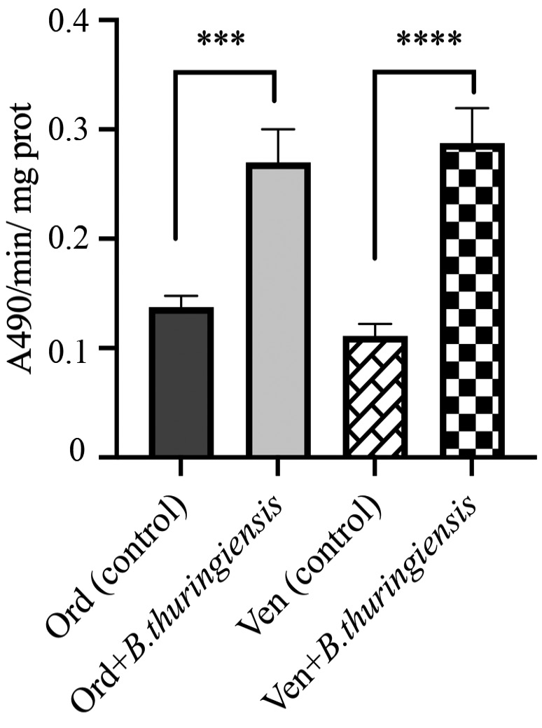 Рис. 5. Активность фенолоксидаз в плазме гемолимфы личинок колорадского жука из двух географических точек Новосибирской области (Ордынский район (Орд) и Венгеровский район (Вен)) через 48 часов после перорального заражения споро-кристаллической смесью бактерий B. thuringiensis ssp. morrisoni (Орд+B.thuringiensis; Вен+ B.thuringiensis). Данные представляют собой среднее арифметическое значение и его ошибку. Достоверность различий определяли с помощью однофакторного дисперсионного анализа тестом Тьюки. *** – p < 0.001 – по сравнению с незараженными насекомыми Ордынского района (Орд контроль); **** – p < 0.0001 – по сравнению с незараженными насекомыми Ордынского (Орд контроль) и Венгеровского районов (Вен контроль).
